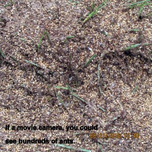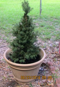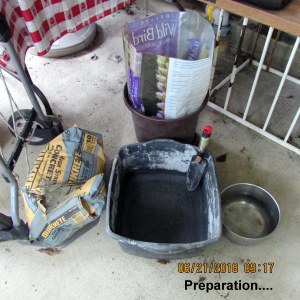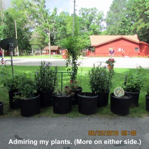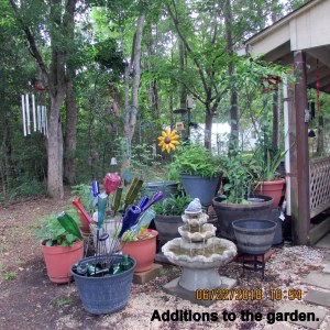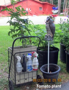 By eleven, it was so hot I was forced to retreat to my air-conditioned trailer home. The Shepherd’s Hook (with a new cement base) joined the garden. I assembled the recent-purchase, half-price Sunflower wind spinner. Trash was cleaned up because an animal (raccoon?) had a party. Other mundane tasks.