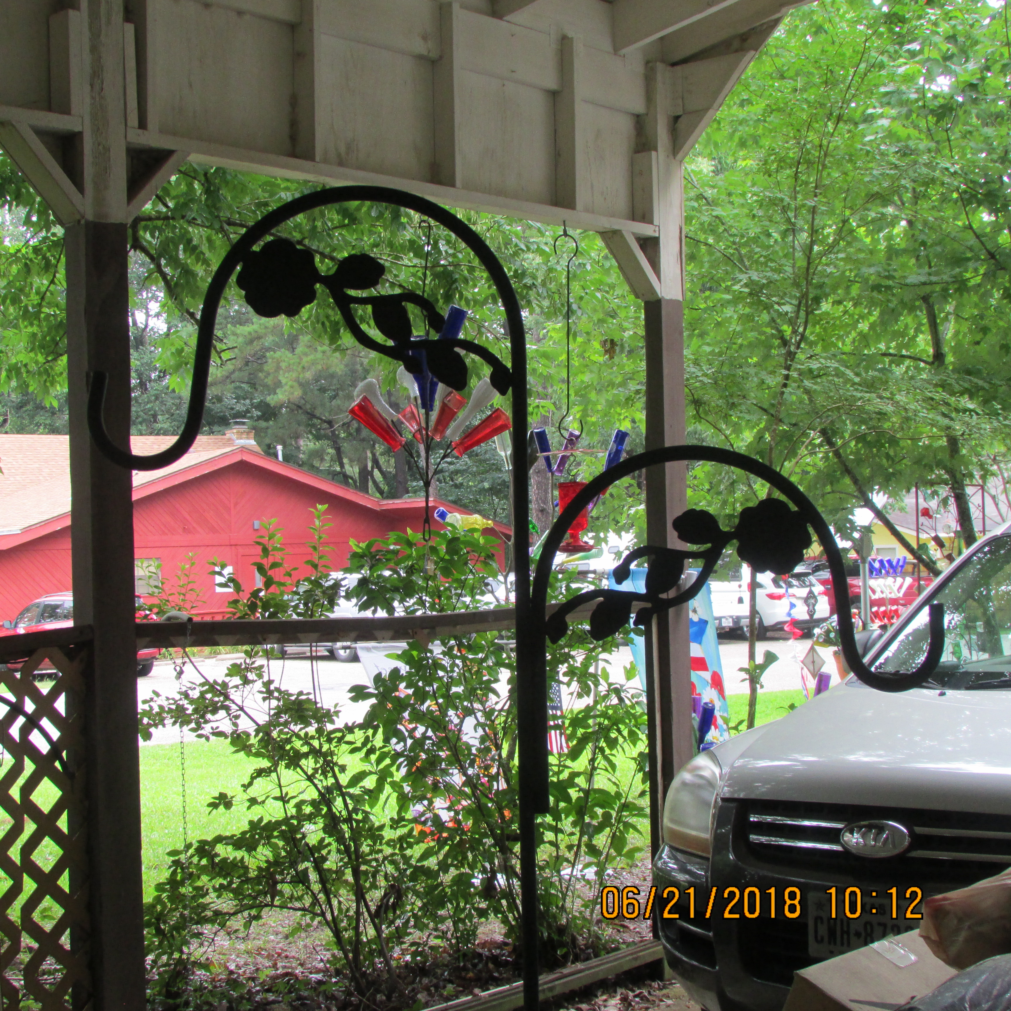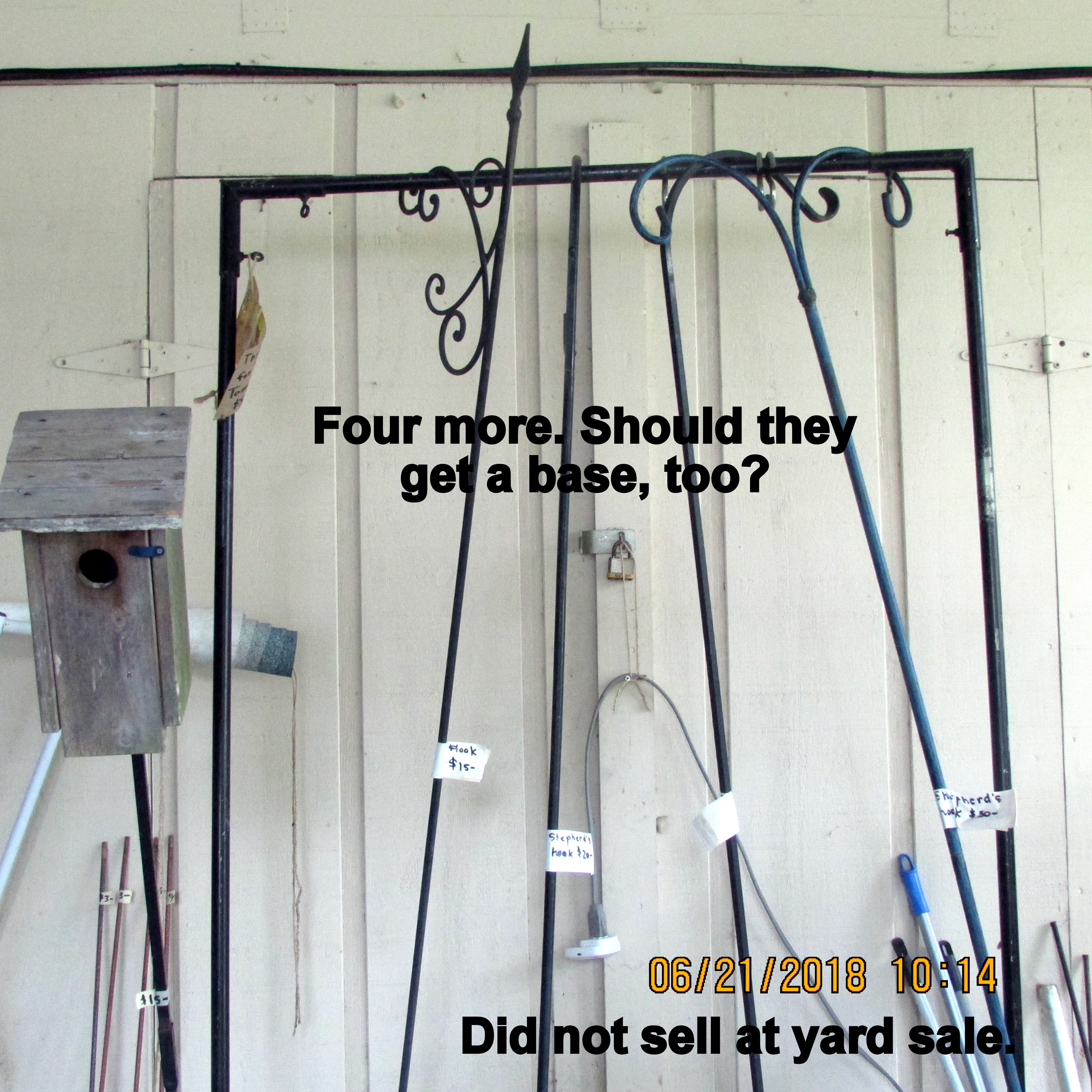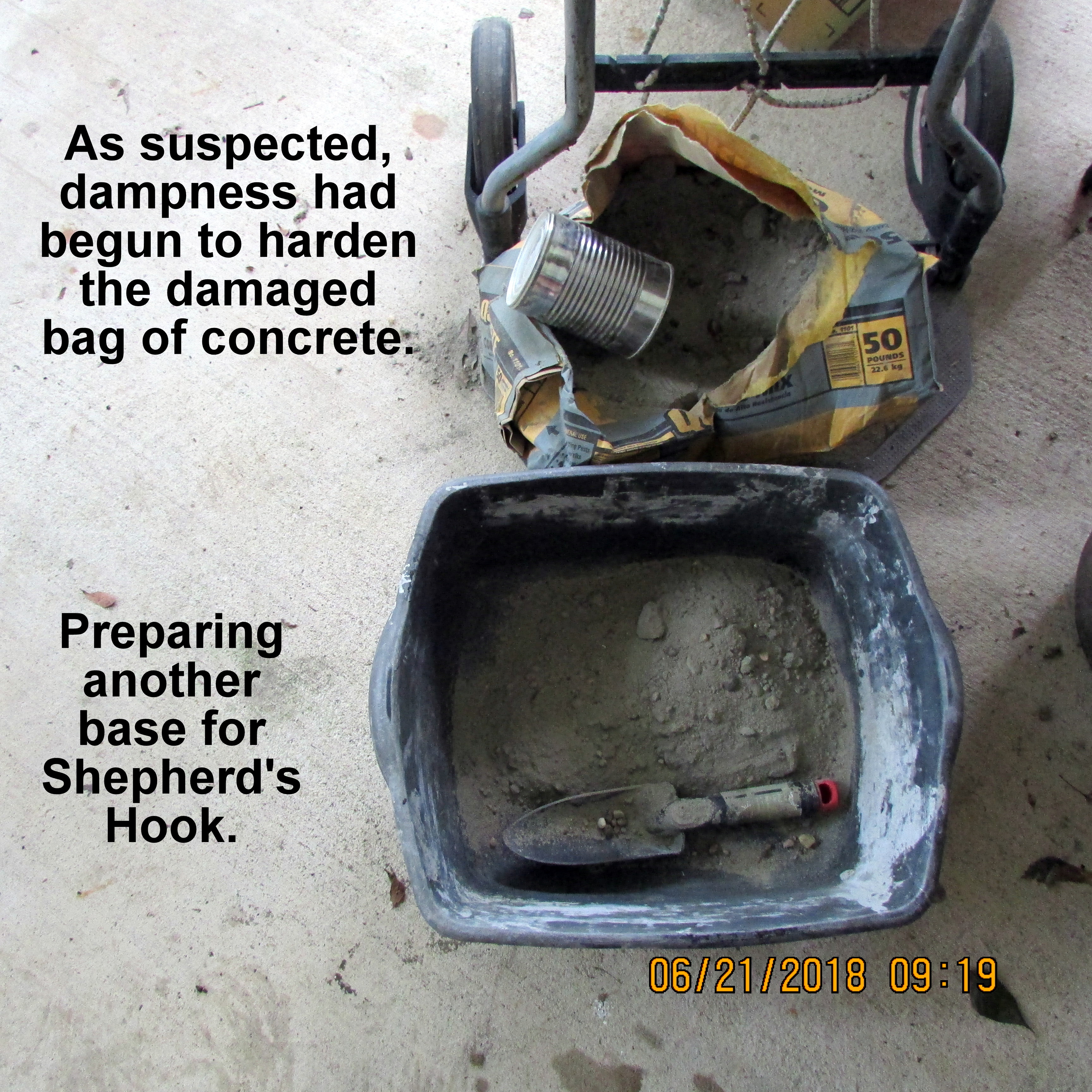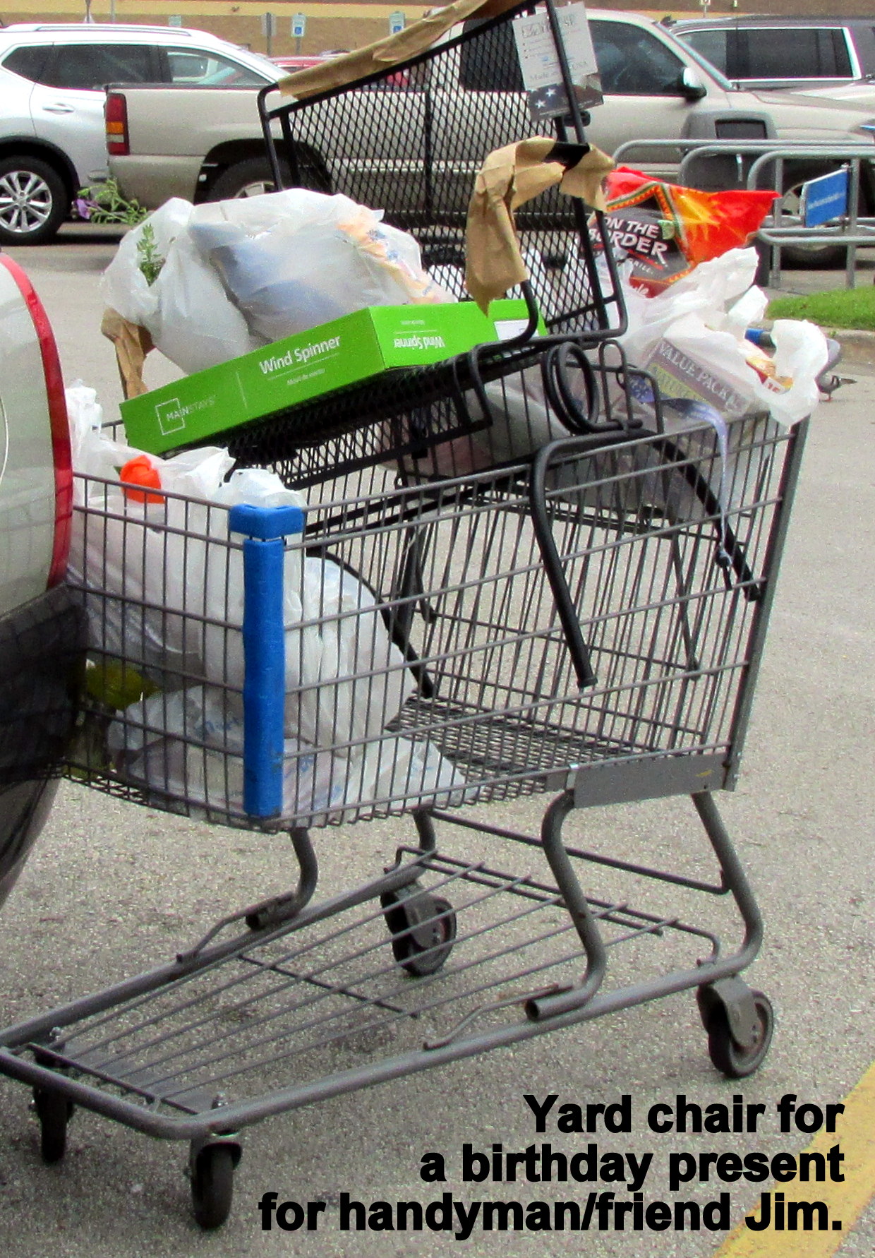 By eleven, it was so hot I was forced to retreat to my air-conditioned trailer home. The Shepherd’s Hook (with a new cement base) joined the garden. I assembled the recent-purchase, half-price Sunflower wind spinner. Trash was cleaned up because an animal (raccoon?) had a party. Other mundane tasks.