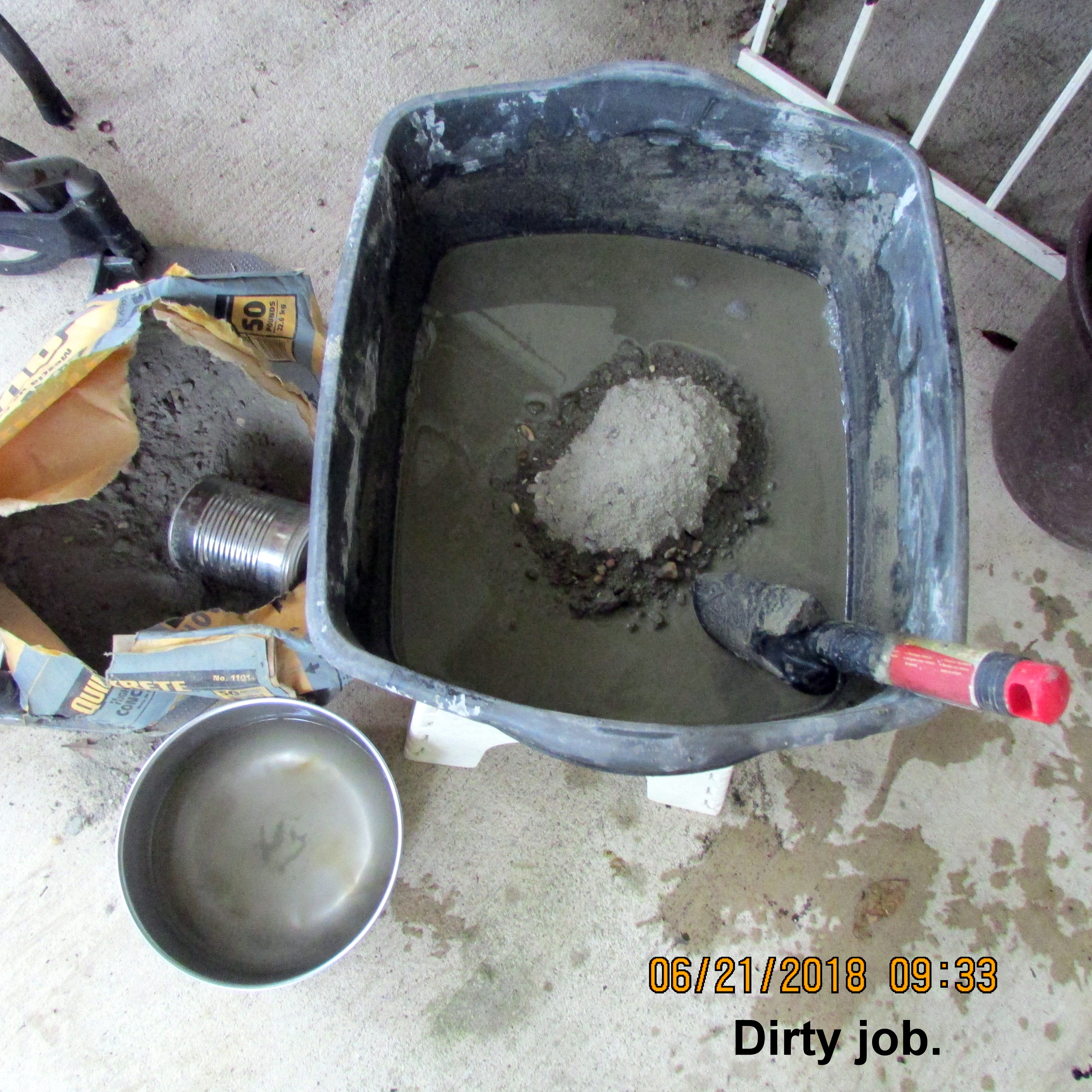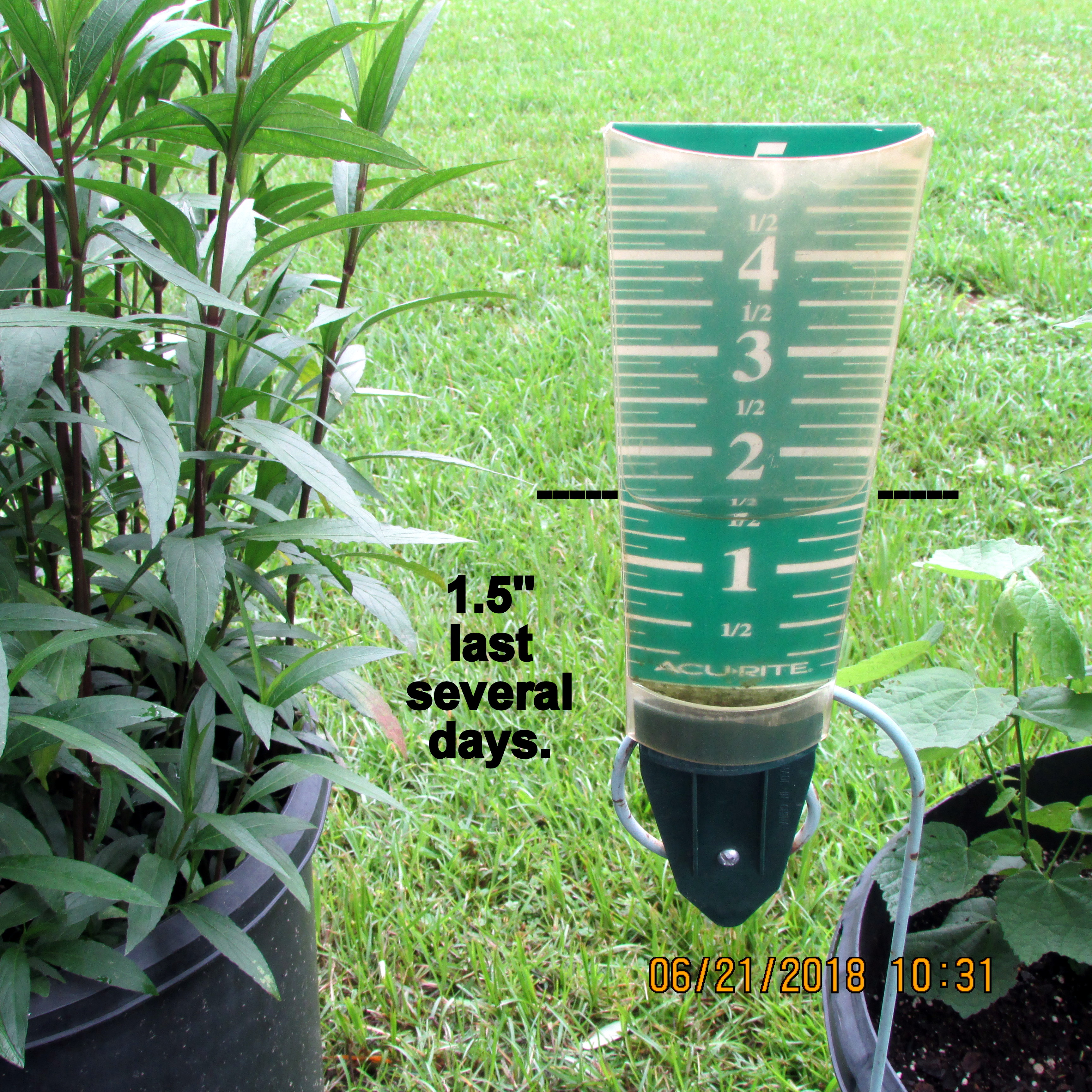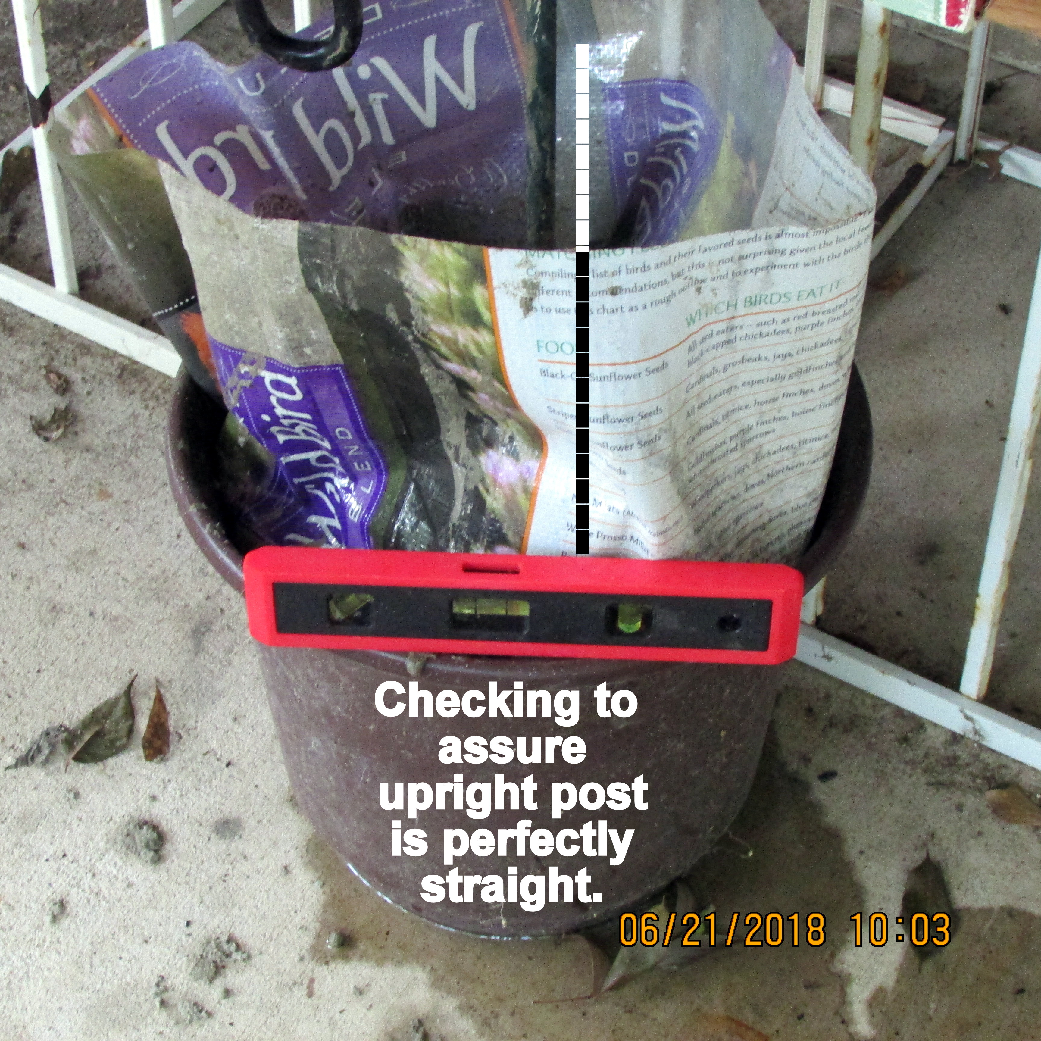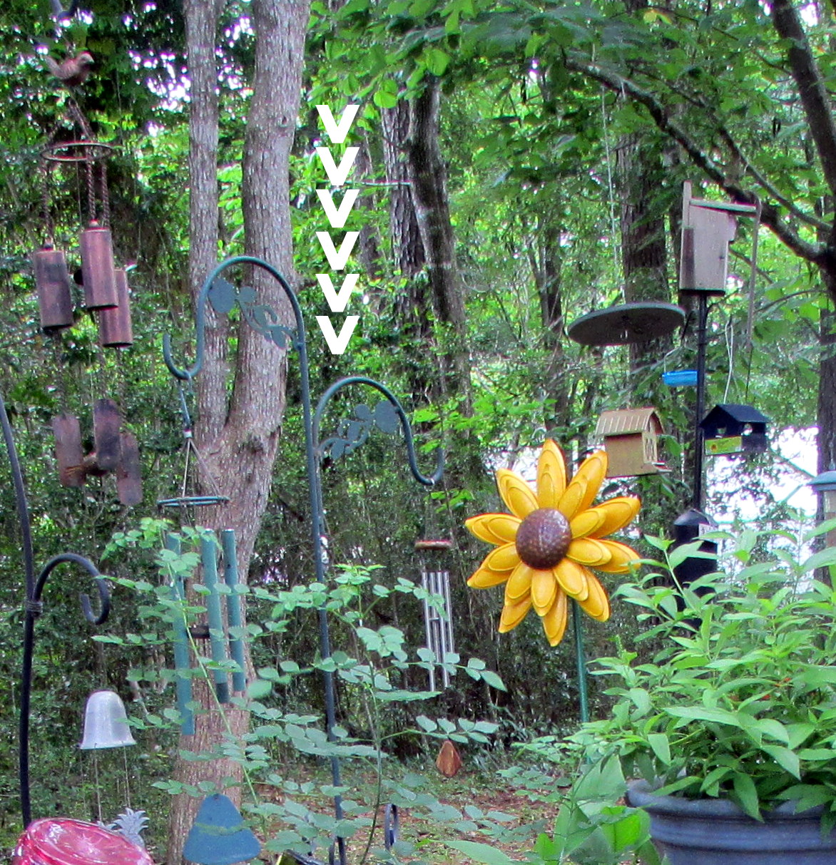 By eleven, it was so hot I was forced to retreat to my air-conditioned trailer home. The Shepherd’s Hook (with a new cement base) joined the garden. I assembled the recent-purchase, half-price Sunflower wind spinner. Trash was cleaned up because an animal (raccoon?) had a party. Other mundane tasks.