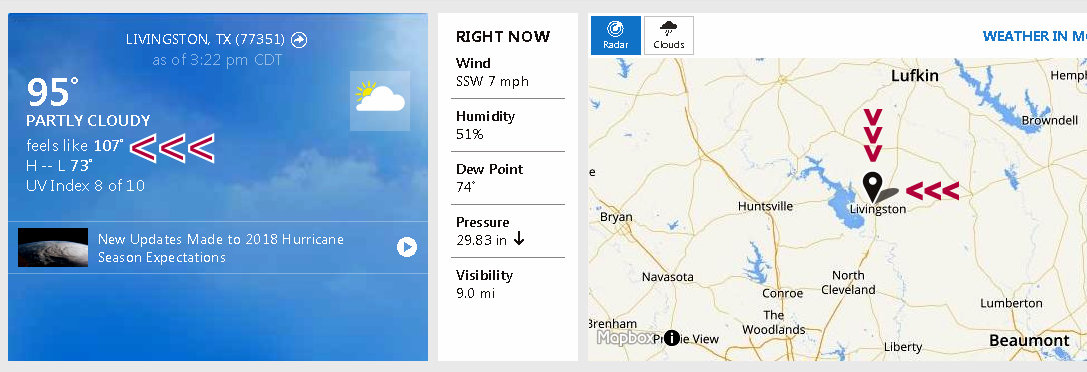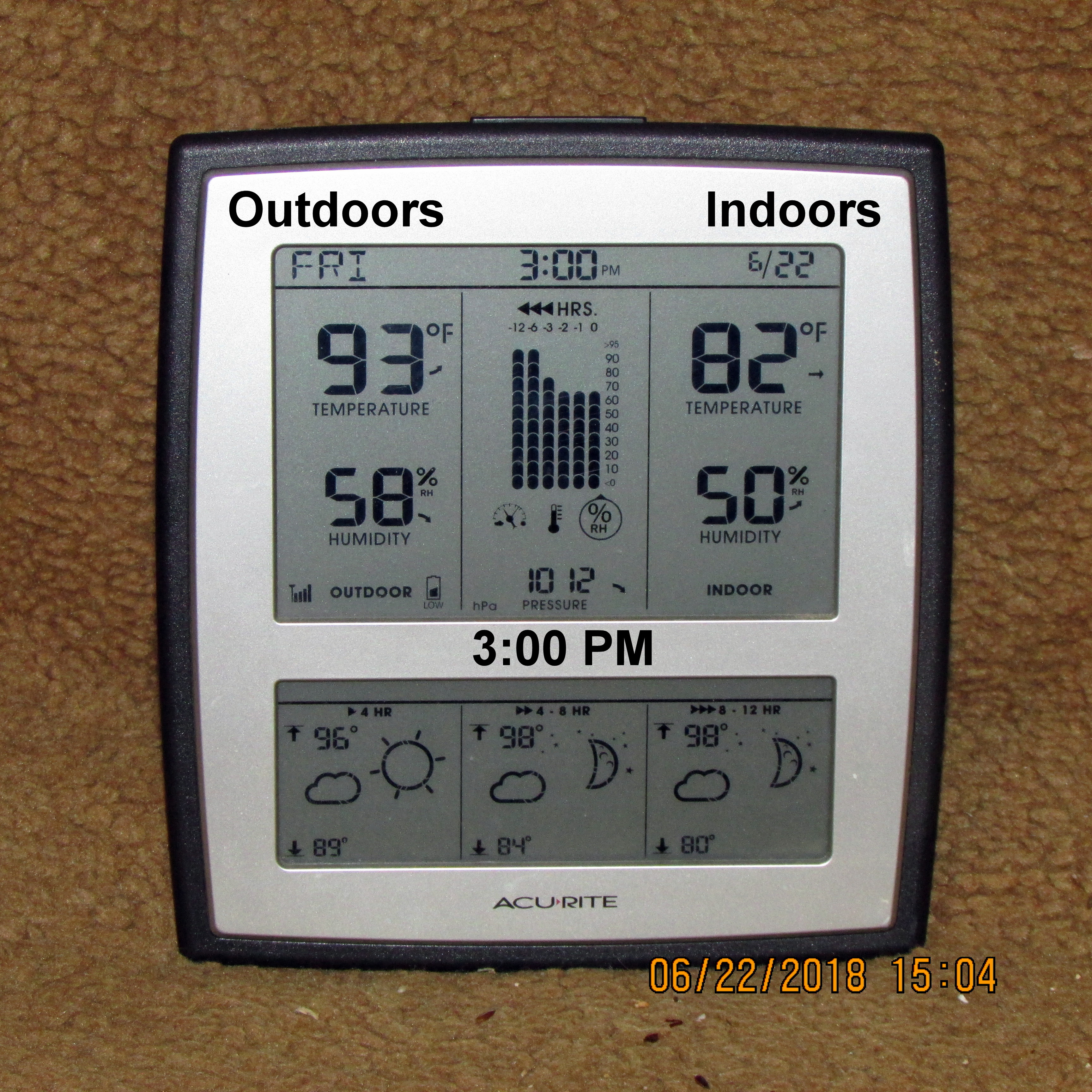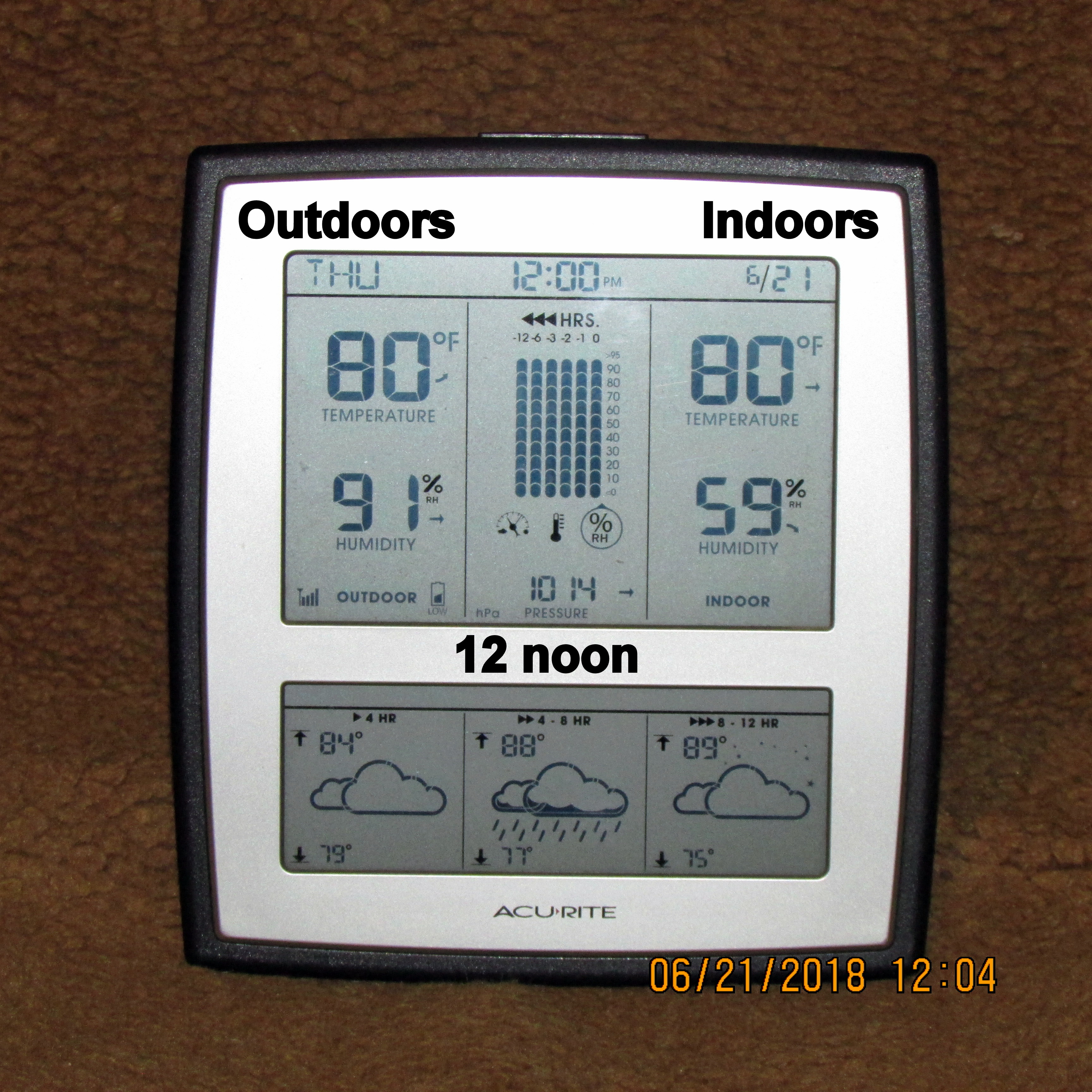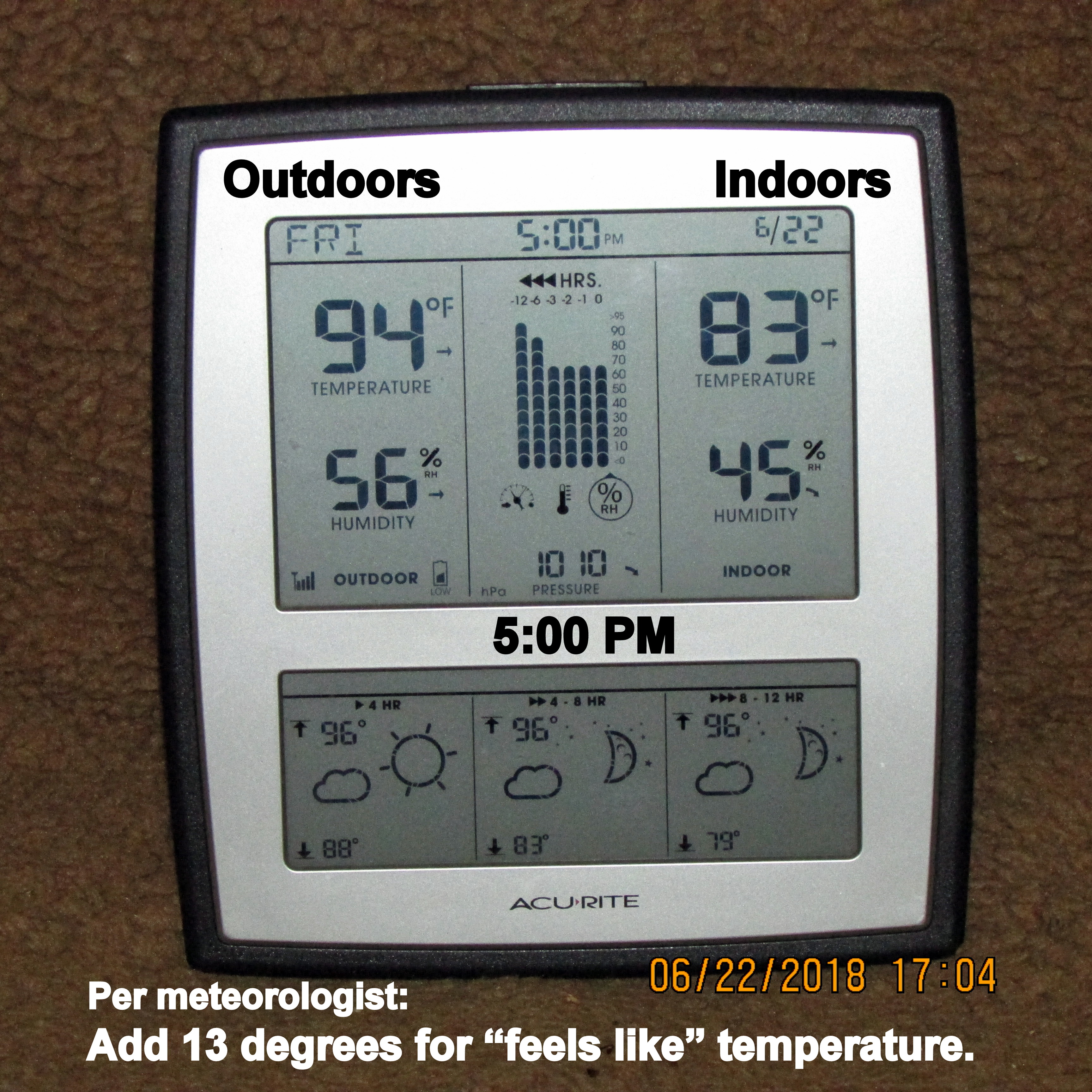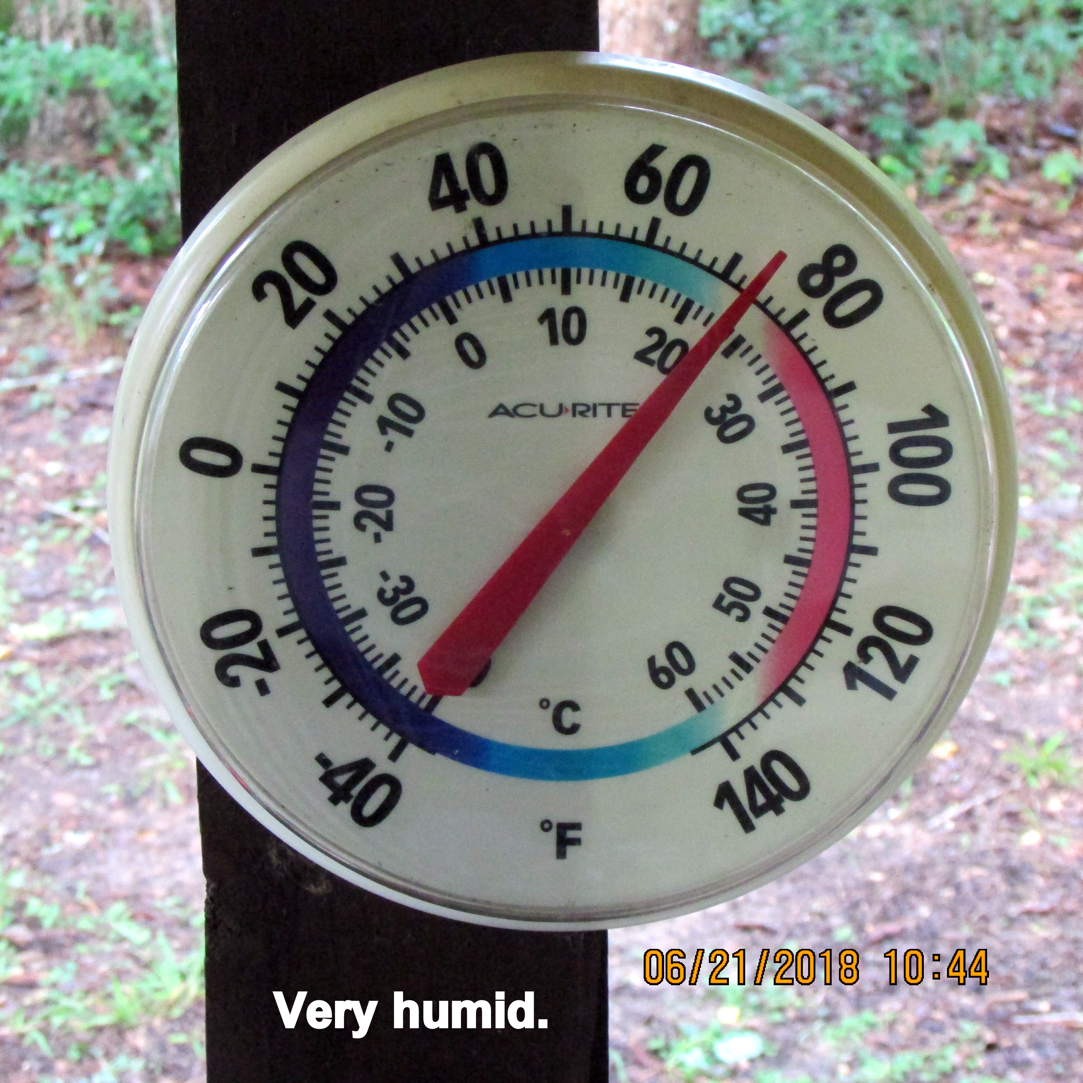 There are clouds intermittently blocking the sun so documented temperature appears comfortable. But look at the humidity. Two fans are moving the air inside my trailer home plus the air-conditioner. My electric bill will be enormous; I hate to drop the thermostat below eighty degrees.