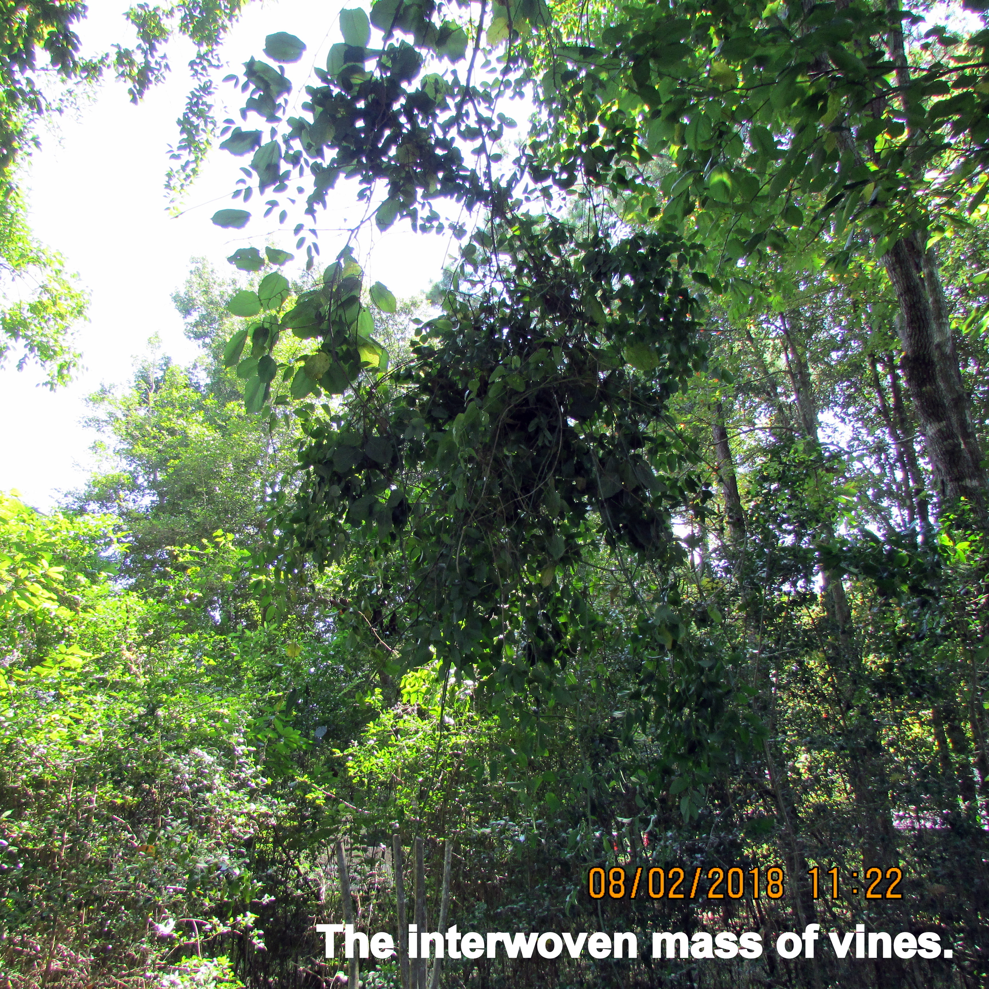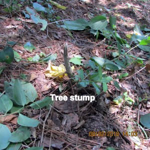 Below are images of two tree stumps protruding from the ground. Remember, this area has been “primitive” and “a work in progress.” To fall on either of those “spikes” would inflict an injury. Tugging a vine that suddenly was free, I lost my balance. Honestly, it was “Divine Intervention” because I could not recover my balance. Again I say, to God be the glory!