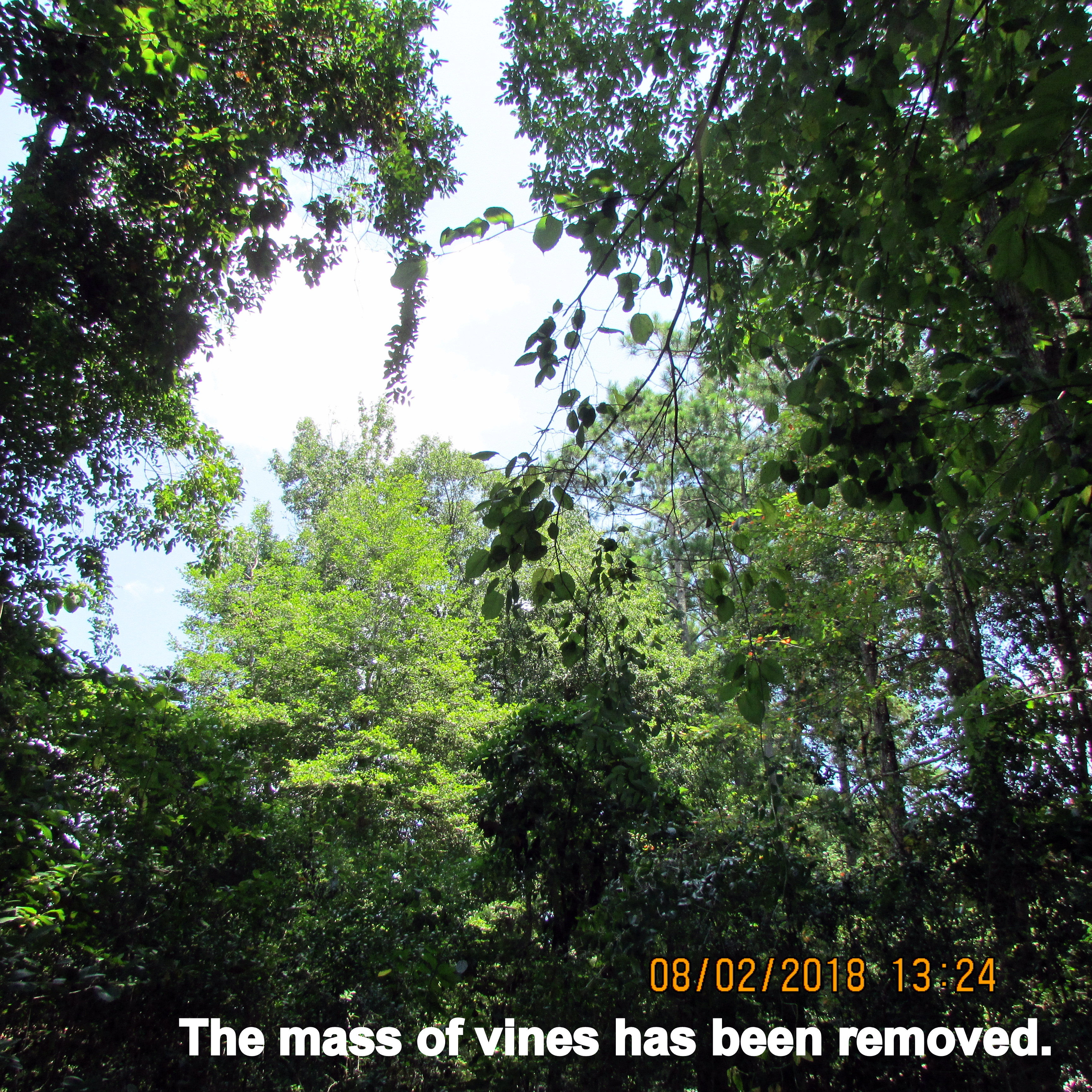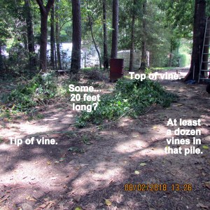 No, not the TV program Touched by an Angel with Roma Downing and Della Reese. I believe an angel put arms (or wings) underneath me and prevented a serious fall. For several days, I’ve been working to remove a tangle of vines woven into the trees near the ground and in the branches above. Not a “lady-like” job but something that would improve the appearance of the back yard. Honestly, the vines were stronger than this old lady. First some tugging, then some resting. One by one they eventually were pulled from the mass. What I actually feared, happened. Suddenly, a vine was free of the tangle and the old lady stumbled and almost fell on tree stumps protruding from the ground. To God be the glory, I was miraculously spared an injury. Directly below, before and after pictures (note the dates).