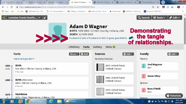 I planned to walk away from Ancestry for a few days but “curiosity made me do it!!” While researching the tangled relationships radiating from my great-grandfather–on my mother’s side of the family–I came across a relative on my father’s side. Six degrees of separation. Unfortunately that branch of my tree hasn’t been developed in my Ancestry tree. Partial information is in the book I published in 1996: Frantz Families–Kith & Kin, Vol. 3, p. 53. To my exasperation, I haven’t been able to develop additional information regarding that family from records on Ancestry. More research needed!! The Wagoner/Swartz information is indelible in my memory. (I’m so grateful for my memory!!) I saw their gravestones in a cemetery in Pyrmont, Carroll County, Indiana.