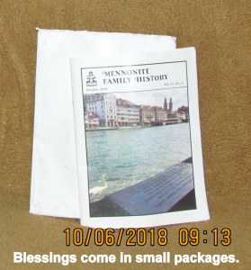 Not so coincidentally perhaps, because I desperately needed encouragement, the “couldn’t come at a better time” blessing arrived in the mail. I hadn’t walked across the street to the mailbox for two days; I hadn’t watered the plants for two days; I hadn’t been outdoors for two days!! To my extreme delight, another one of my stories was published in Mennonite Family History. Read the story published on an earlier blog message.
