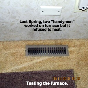 Before severely cold weather, I wanted to “test” the furnace–in case I need to contact repairmen. It appears to be working fine, Praise the Lord!! ~~ Furthermore, the RV refrigerator is “working”–but not extremely cold. An angel repair?? Perhaps the extreme heat took a toll on the refrigerator like it took a toll on the old lady??