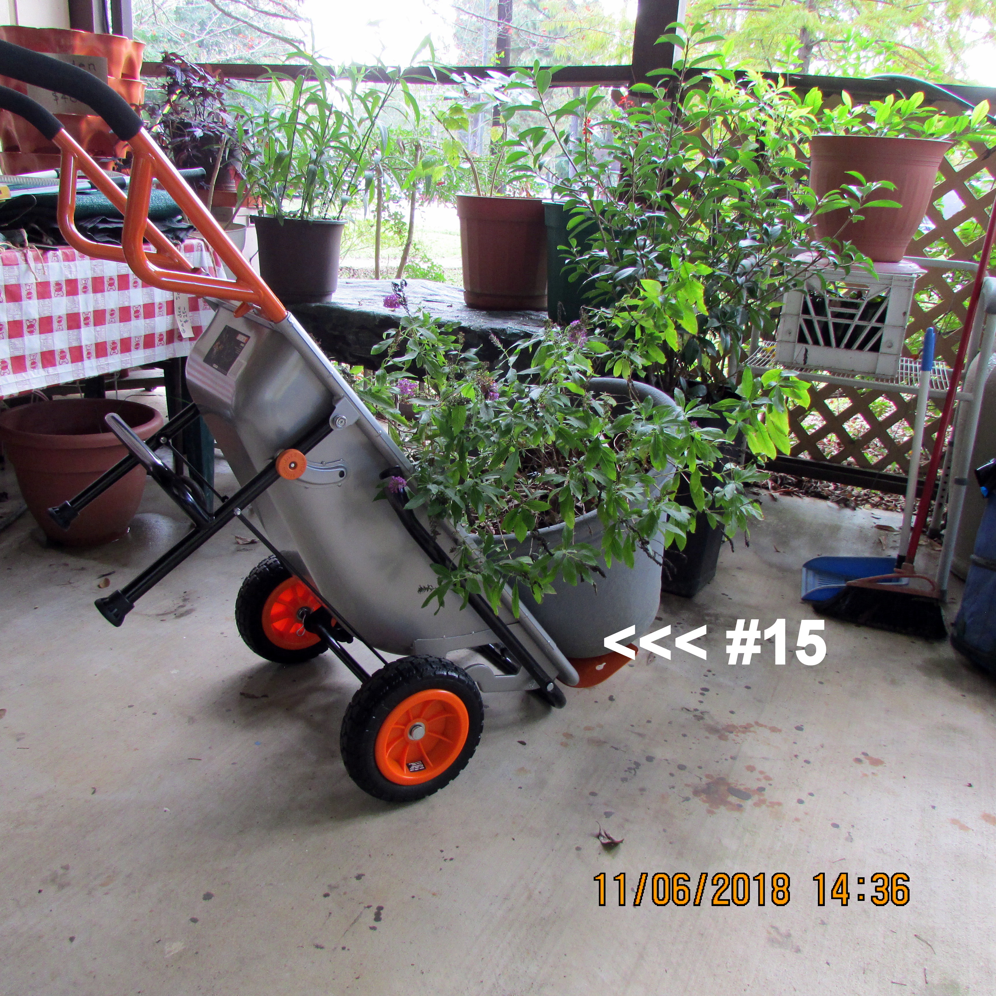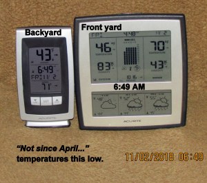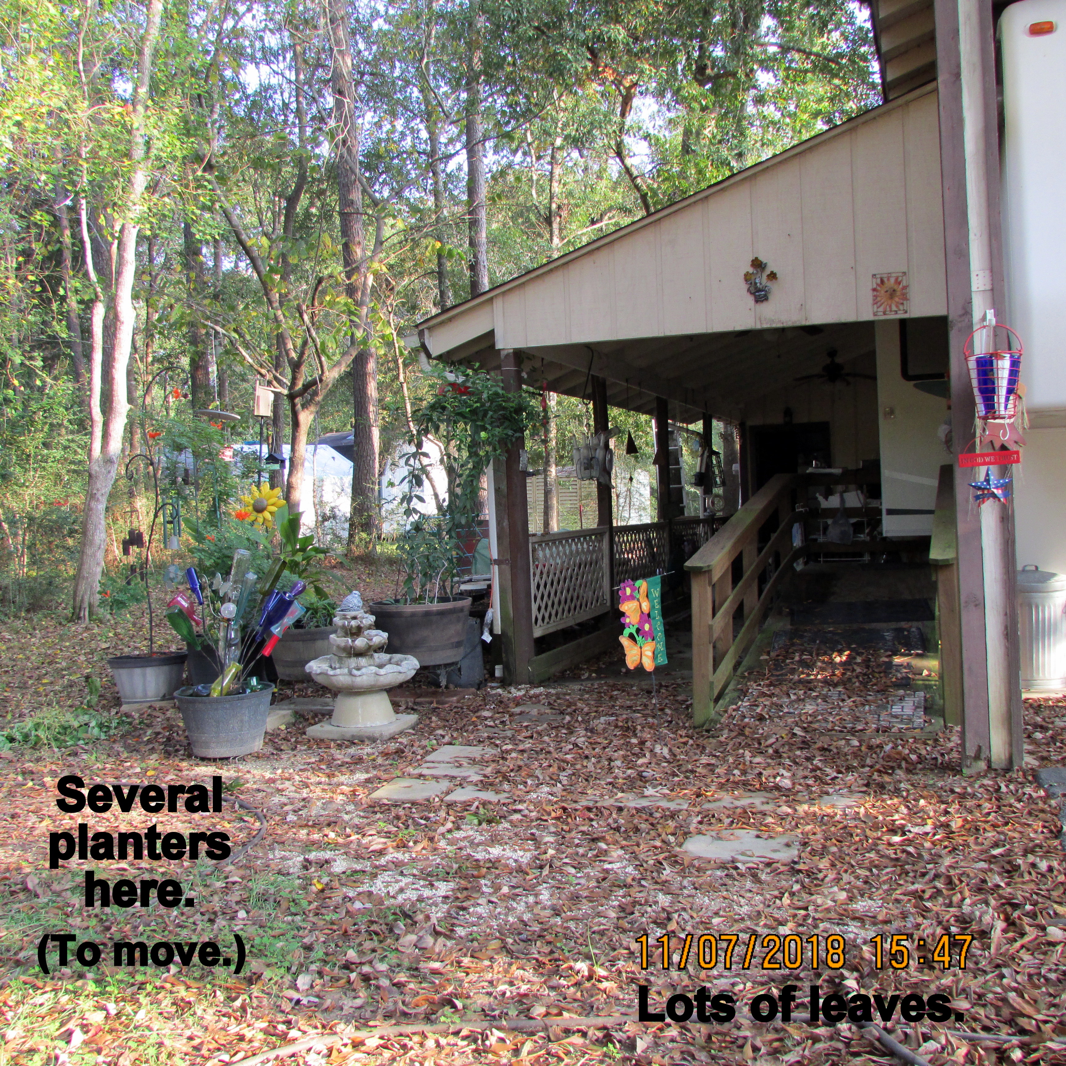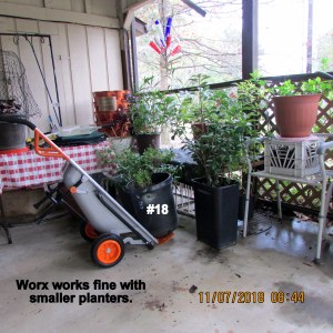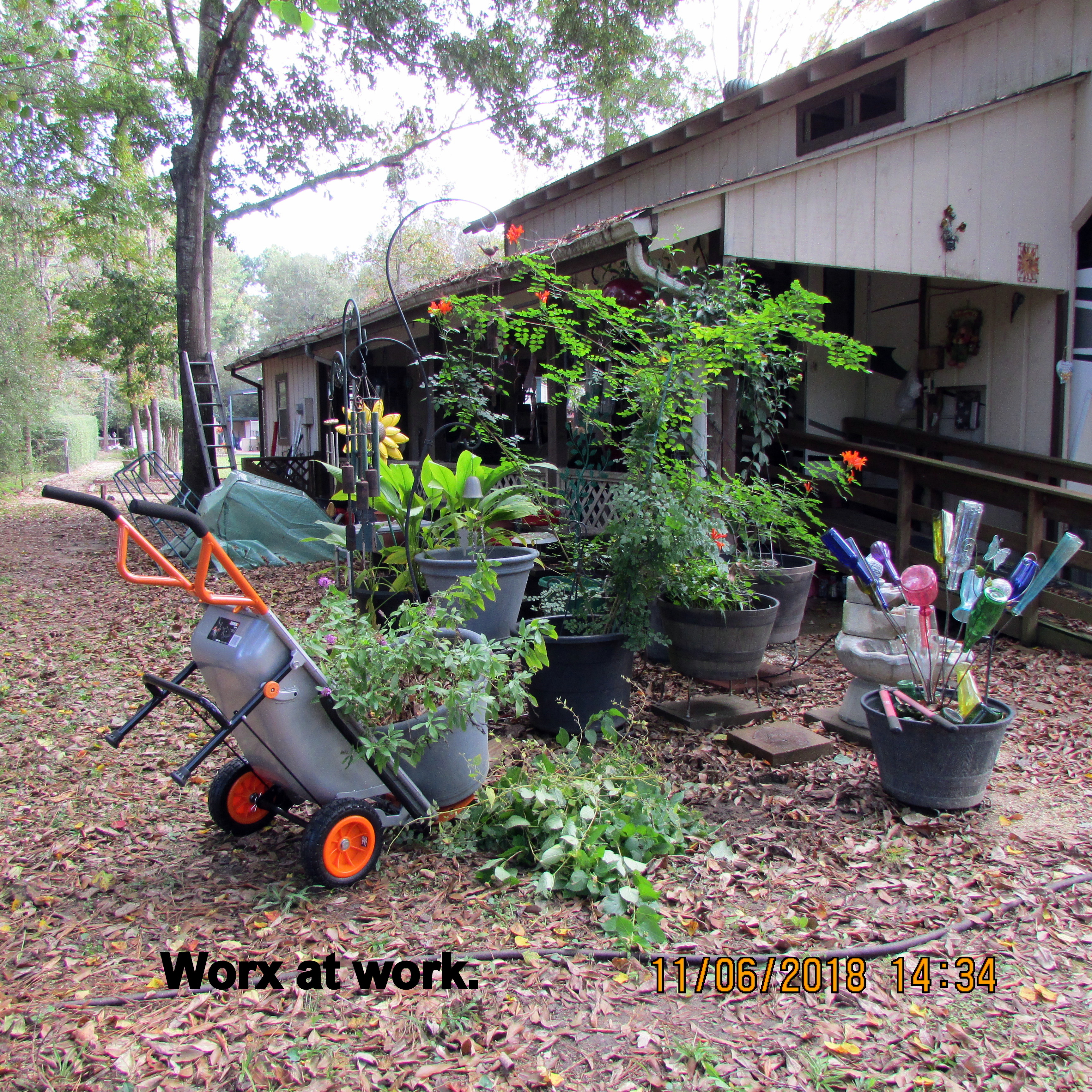 Beautiful day; the yard beckons. I swept leaves and deposited them around plants, in planters (excellent mulch). Shifted things (yard sale items) so more convenient for planters. One day soon, I’ll move the LARGE planters with Worx Aerocart.