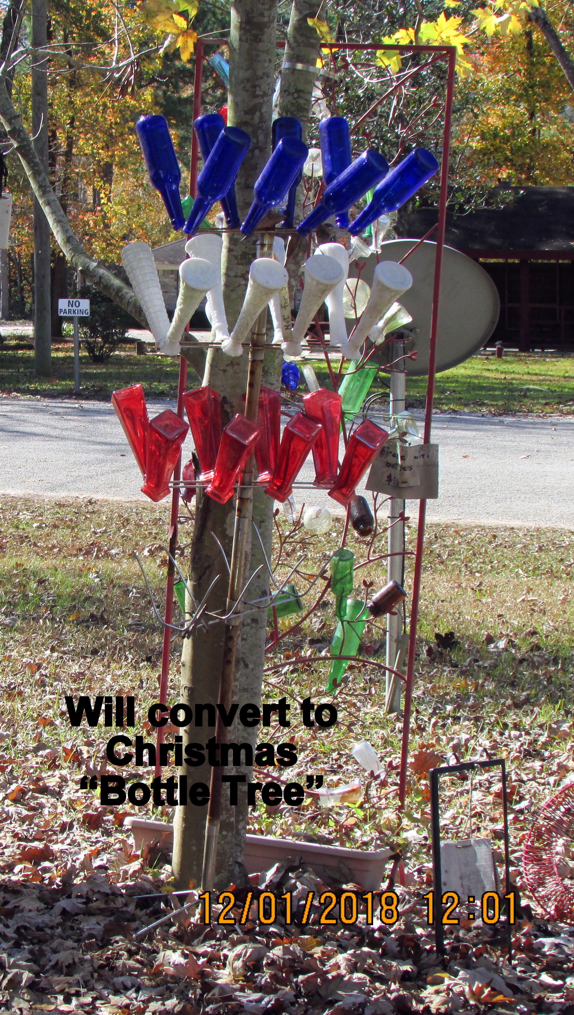 I fondly nurture the little Christmas tree of a dear friend. “No,” it will not be on display at the CARE Center. Likewise, since I was evicted from the CARE Center, there won’t be a “Christmas Bottle Tree” (pictured above). Lord willing, I’ll recreate the Christmas Bottle Tree in my yard.