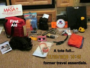 First Aid supplies, tire pressure gauge, flash light and fresh batteries, rain poncho and rain pants…. All deemed “essential” when I was traveling. Do I  “dust them off” and return them to the KIA?? Obviously, I can discard the “reward cards” for business establishments miles from my home. (True story: I haven’t seen a Sam’s Club, Kroger, Kohl’s, etc., etc., for more than five years!!)