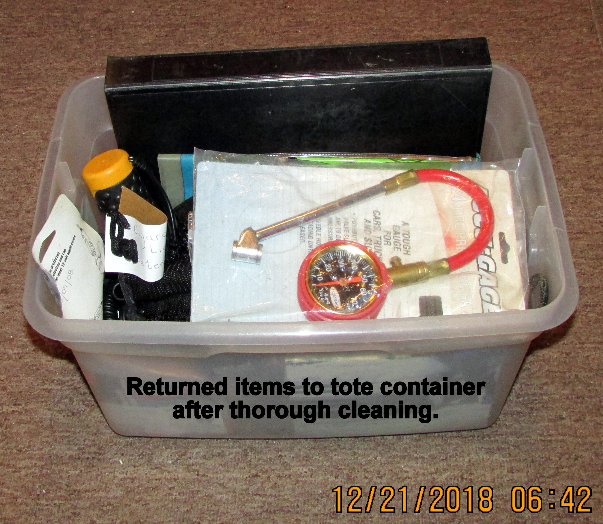Next morning, and honestly must report items were cleaned and returned to washed tote container. Back to KIA; maybe useful eventually.