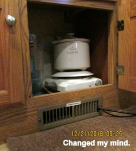 Now often have you heard me refer to this blog as my journal?? Rarely, a comment to my blog message. (Does anyone read my messages?) To my absolute utter astonishment, a phone call from a friend concerned about the problem with my propane furnace. The individual shared my concern a possible disaster was averted. The local RV repair shop had been contacted and repairmen scheduled. “But I can  ‘make do’ with the heat strip, and space heater.”  My protest was followed with concern: “You’ll suffer when the temperature dips to eighteen degrees.” ~~ A generous gift from a Christmas angel.