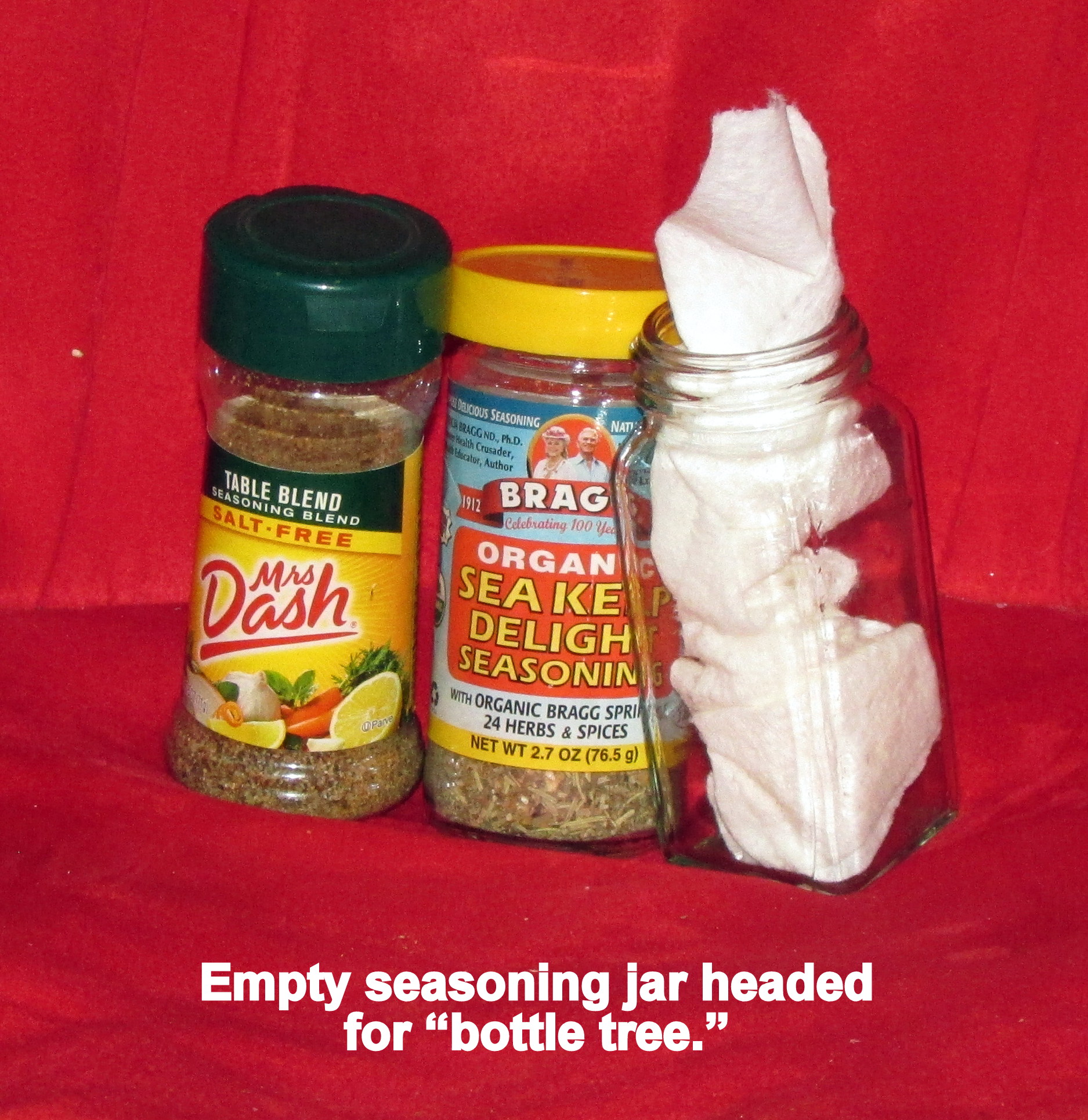 Very few references to “bottle trees” and “bottle bushes’ lately. An almost empty “spice” container was emptied (into lima bean soup), and cleaned, and will join other small bottles on the “frame-work.”