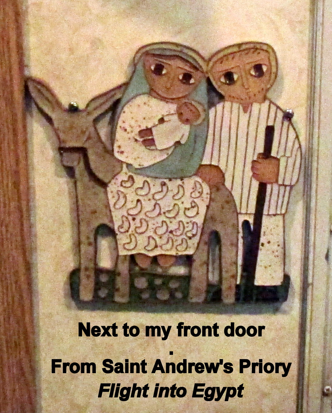 Using the chair (by the window, next to the door) for a backdrop, I was reminded of Saint Andrew’s Priory, Valyermo, Los Angeles County, California (less than fifty miles from my home in Lancaster). The unusual crafts were unique, frequent Christmas gifts. ~~ Nostalgia prompted me to retrieve, and wear, the “California”  sweatshirt.