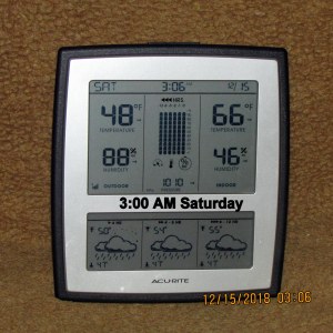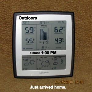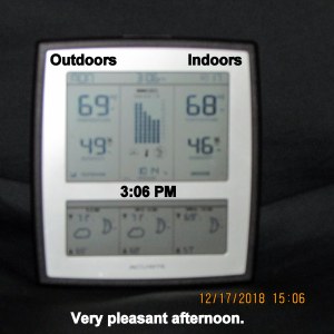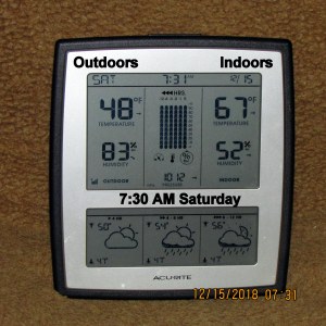 Cold, cloudy, windy morning!! Outdoors, standing water puddles from occasional rain. Old lady is tired, with aches and pains. Discouraged because pictures would not “up-load” from Canon camera and Picasa. Google retired Picasa several years ago but I’m a creature of habit and still use that software program. I hate this time of year because TV (et al) emphasis on Christmas and families, parties and presents. I’m eager for 2019. Right now (9:45 AM) I want to go back to bed (and cover my head). Clarification, I love Jesus but He gets lost in hustle and bustle.
