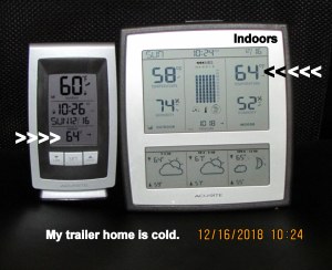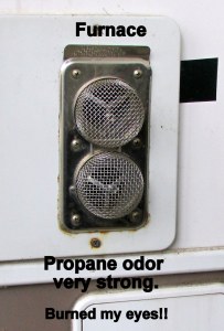 I switched from furnace to “heat strip.” Perhaps an hour later, I “switched back” to furnace. I went outdoors to double-check if it ignited. “Yes,” but the smell of propane was nauseating!! My eyes started burning. The old lady almost RAN indoors to turn off the furnace. Last winter, I survived the cold weather with “heat strip” and space heater. Space heater retrieved from storage trailer. I’ll “weather” the weather (lol). I’m thinking I’m extremely fortunate there wasn’t a fire that would have (very likely) destroyed my trailer home, KIA, and worldly possessions.