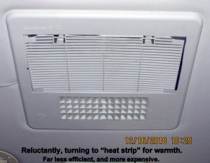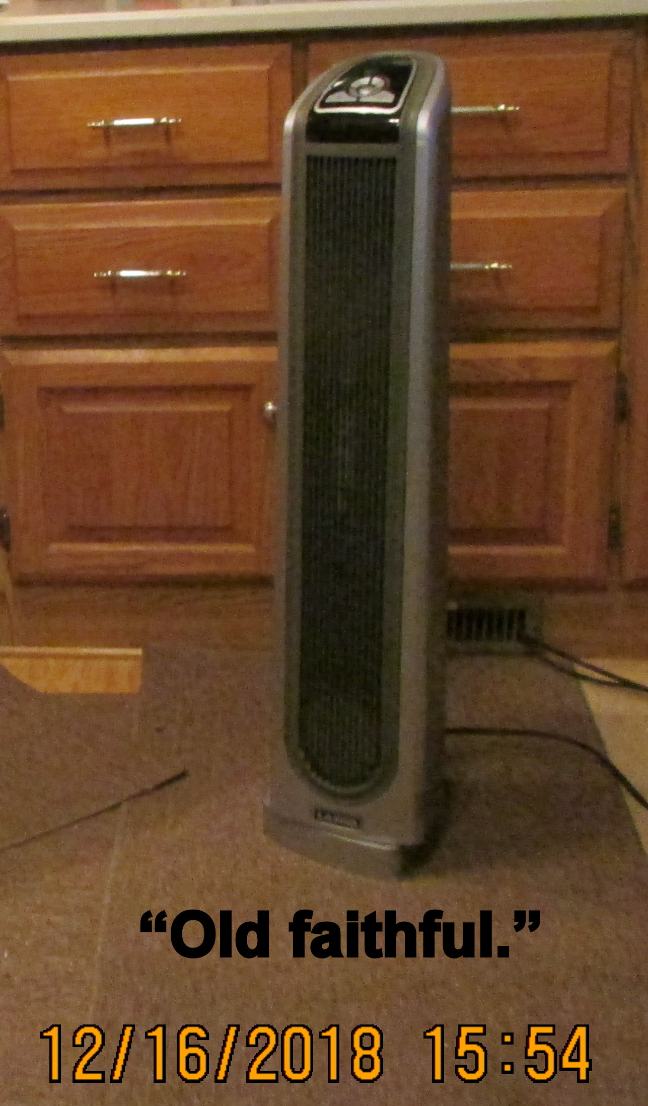 “Just the facts, Ma’am; just the facts.” Famous words from Jack Webb on Dragnet TV series. ~~ The old lady has a variety of quality supplements to keep her in good health. For brunch, add organic steel-cut oatmeal, slow-cooked, with raisins for a bit of sweetness. “I’m cold” was a recent lament. Attempting to warm the trailer, punch the numbers higher and higher. Then the realization: “The furnace isn’t working!! That’s why there has been the odor of propane?!” An RV-friend was consulted about all things propane and the recommendations were numerous. Reading the suggestions, cold and tired old lady wanted to go to bed and cover her head!! ~~ “Cold and tired old lady” is going to don the Slanket and go back to Dr. Scholl’s heated massager. ~~ An hour later and trailer temperature has reached seventy degrees. “Heat strip” is less efficient.