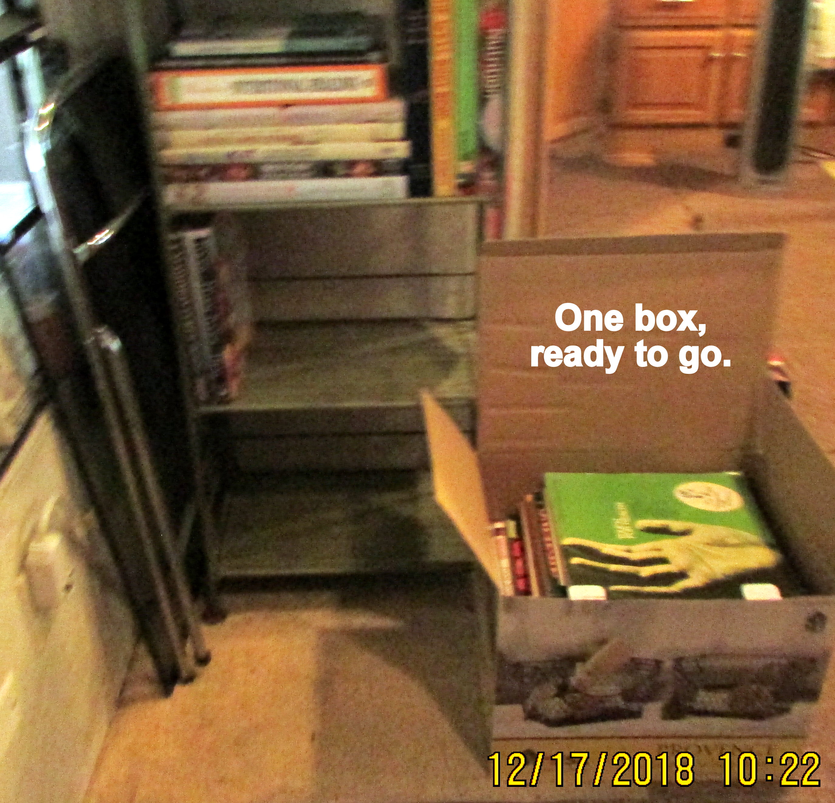 It is a pleasure to report that there was a “dent” in the clutter in the living room of my trailer home. Books were packed (with some stored in cargo trailer); book shelves were rearranged; minimum remaining Christmas packed; “odd” items boxed for next trip to Habitat for Humanity thrift store. Furthermore, an empty box in the living room awaiting items to be donated….