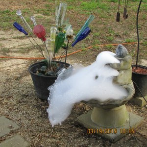 Pollen isn’t a problem with the bird bath/fountain. I am bleaching and washing away green and black algae stains. ~~ I love that fountain!! Furthermore, the squirrels and birds love it, too. But it is solid cement, in five sections, and bottom three sections are too heavy for me to handle. “Bye bye Birdie” bath.