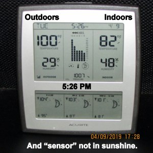 Late afternoon sunshine pushed the registered temperature higher than accurate. But TV meteorologist said “90 degrees” in some localities (near Houston). ~~ Poor choice: I’m eating left-over beans (for supper) because I want to empty the pan. I need to make nectar for the Hummingbird feeders. “Yes,” Hummingbirds have arrived.
