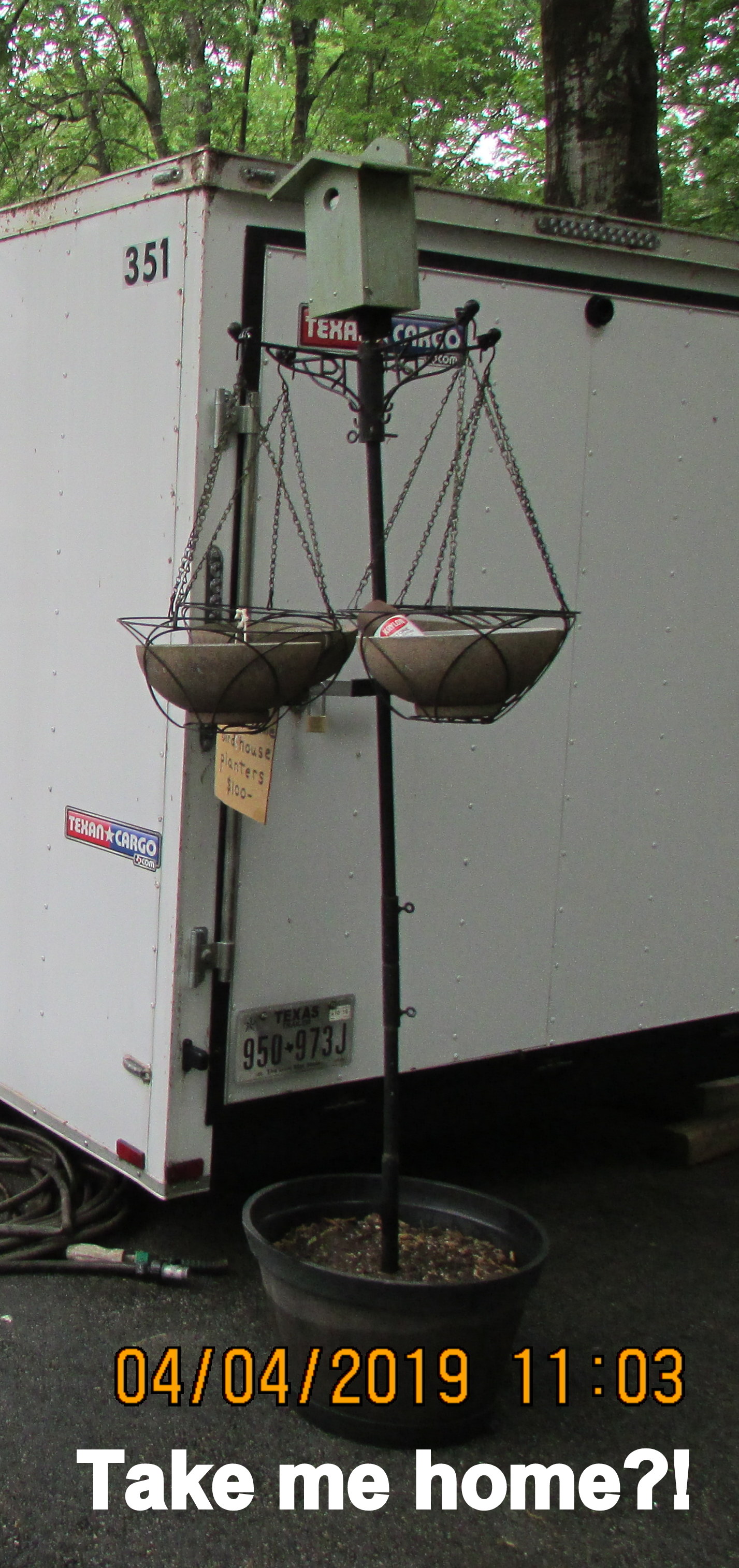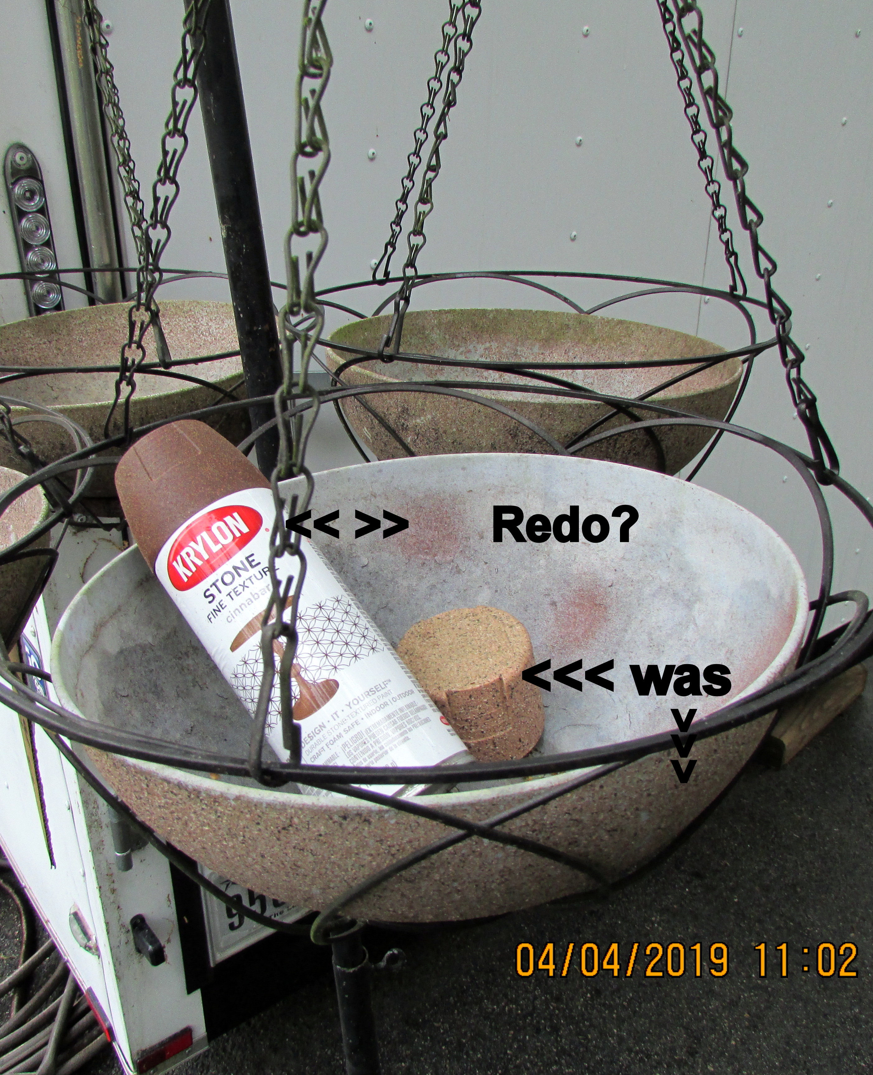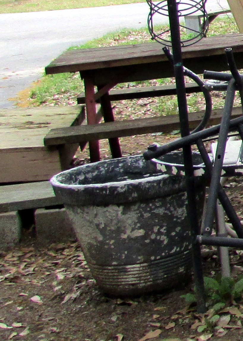 Remember that big ugly planter? Offered “free” (to a lady with a bad back) and a welcome addition to the other items and her $4.00 purchase. I nearly killed myself lifting it over the top of the pickup truck tailgate. A “clay” planter, with soil, and very heavy. I’m in pain!