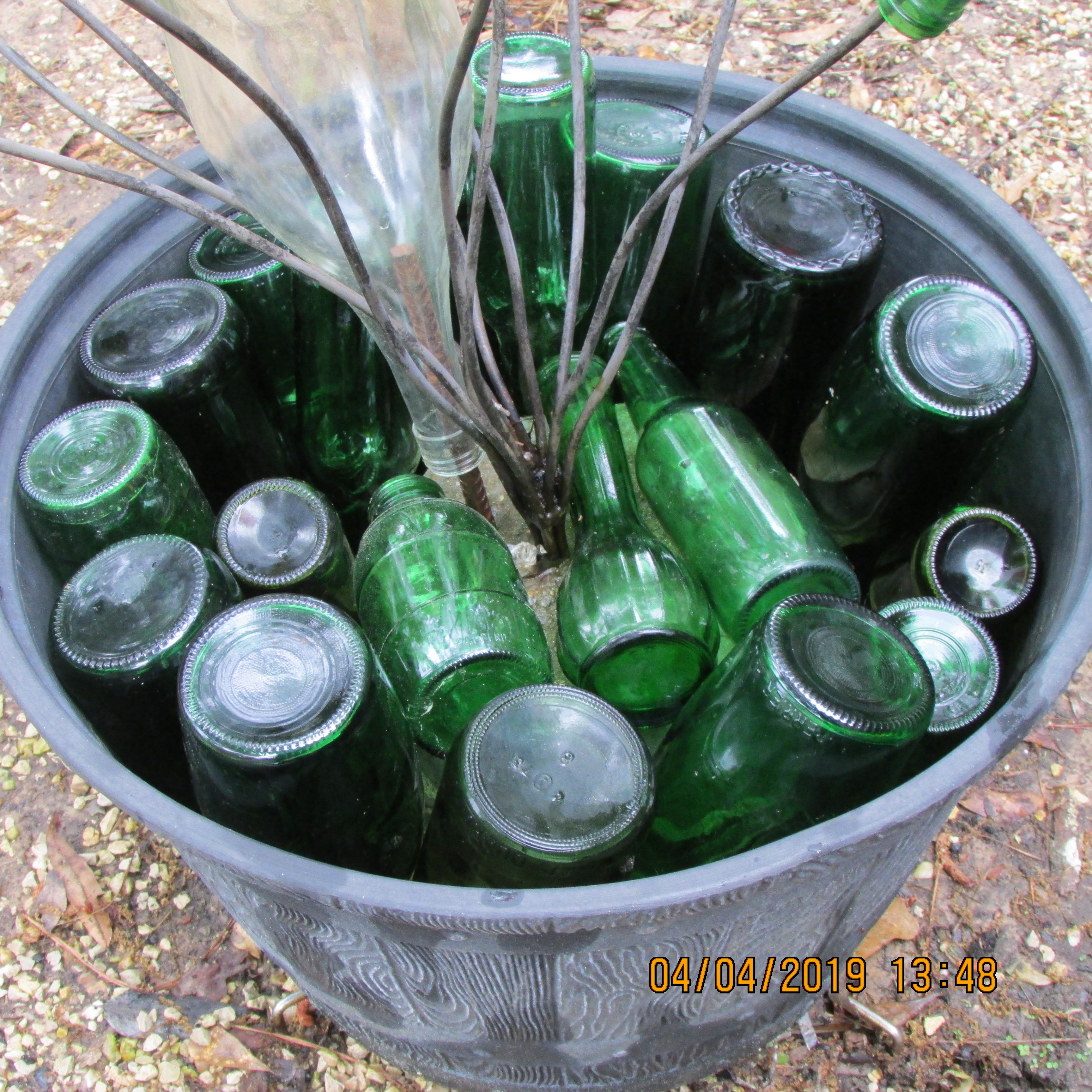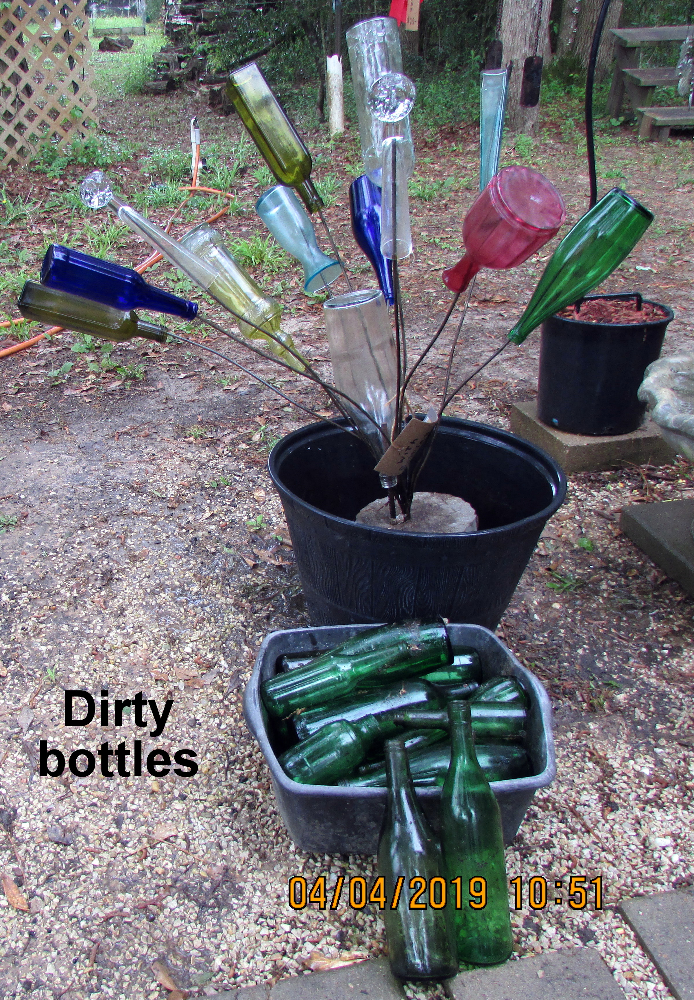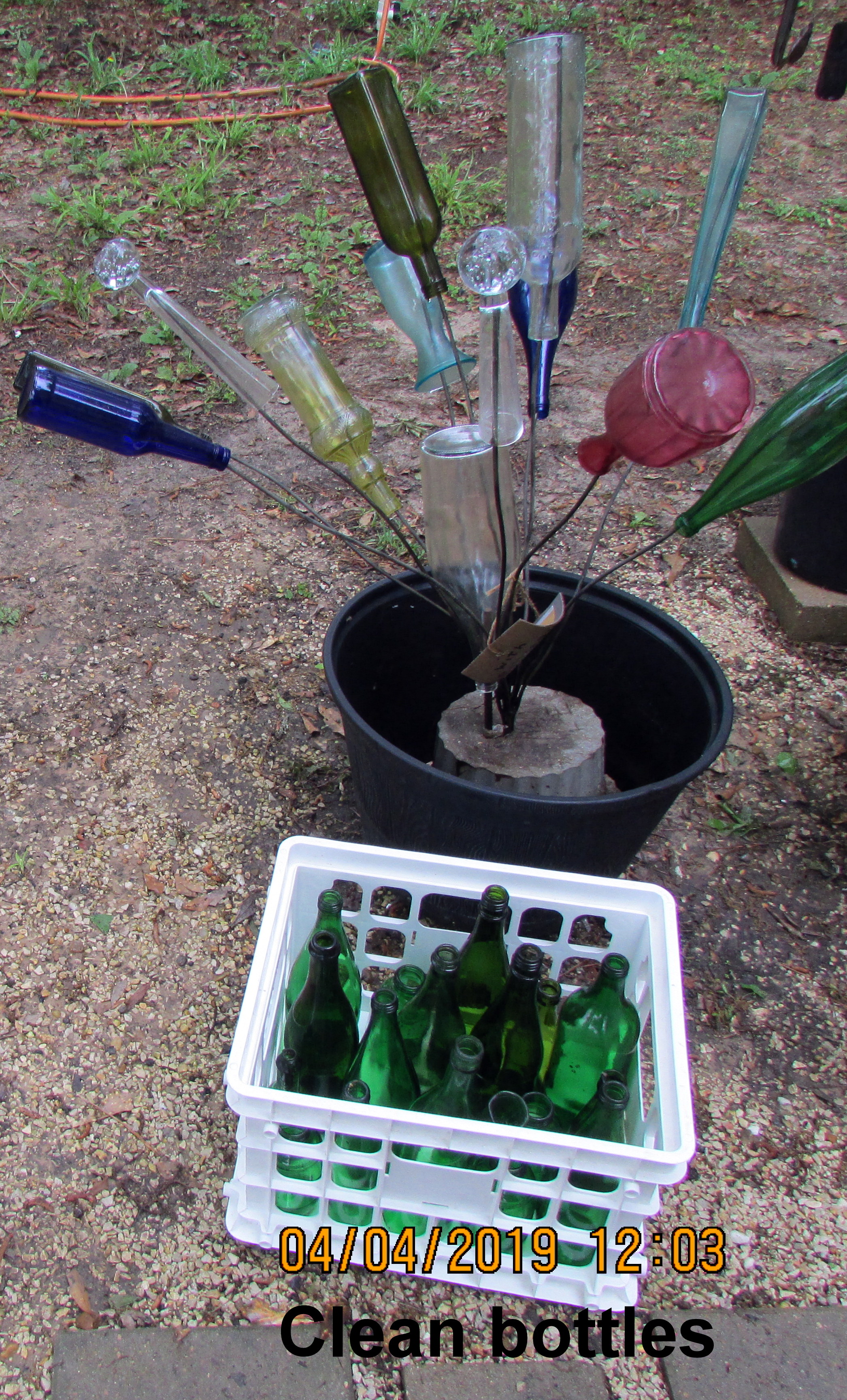 Several “Lookie Lou” but nobody interested in my “big” items. ~~ We share the laundry room and neighbor was doing laundry. I rushed to wash more bottles. “Bottles” in bottom of planter to simulate grass or lawn.