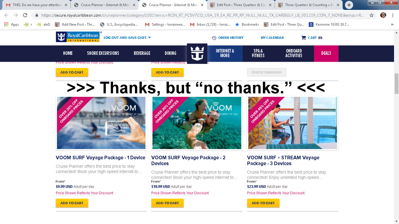 The last thing I want to do “on vacation” is spend time on “a device.” I took a peek at this, out of curiosity, and ignored the booze, spa, and multiple other pre-cruise specials. OMG, they get into our pocket at every turn! Parking for one week: $80.00, and that was a discount because my lady-friend