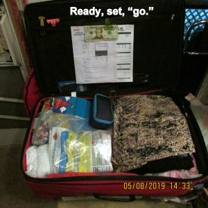 Very unusual activities today. (1) Packaged supplements for the cruise (daily, individual, small plastic bags). (2) Created small containers of shampoo, conditioner, lotion, etc., etc.. (3) Defrosted the freezer because (finally) RV repairman is returning (tomorrow) to repair the RV refrigerator. (4) The thrift-shop purchase suitcase is packed and I believe I have “more than enough of” everything for one week. Curious observation: Searched for the link re: suitcase purchase and noted I bought travel-size shampoo, etc., several weeks ago. I forgot… and didn’t check things already packed….