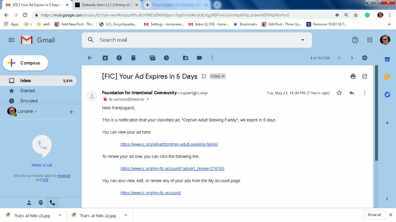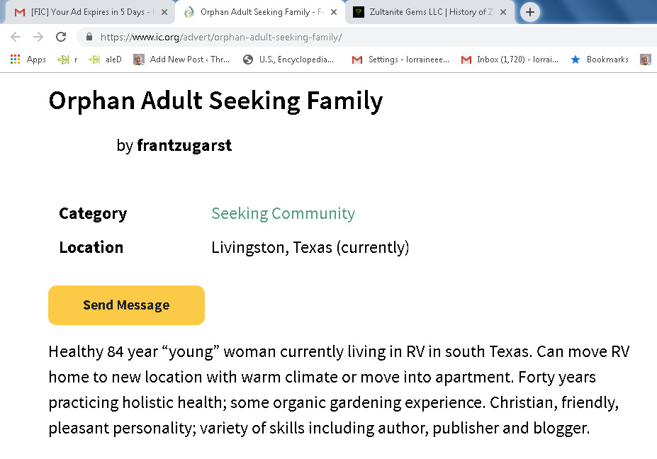 Only two responses (many weeks ago) to my ad. I won’t renew the advertisement in Foundation for Intentional Community. I’ll continue to enjoy my current excellent living arrangements and trust that “my intentional community” will find me at the appropriate time. No response to my ad is “the measure of my worth”?