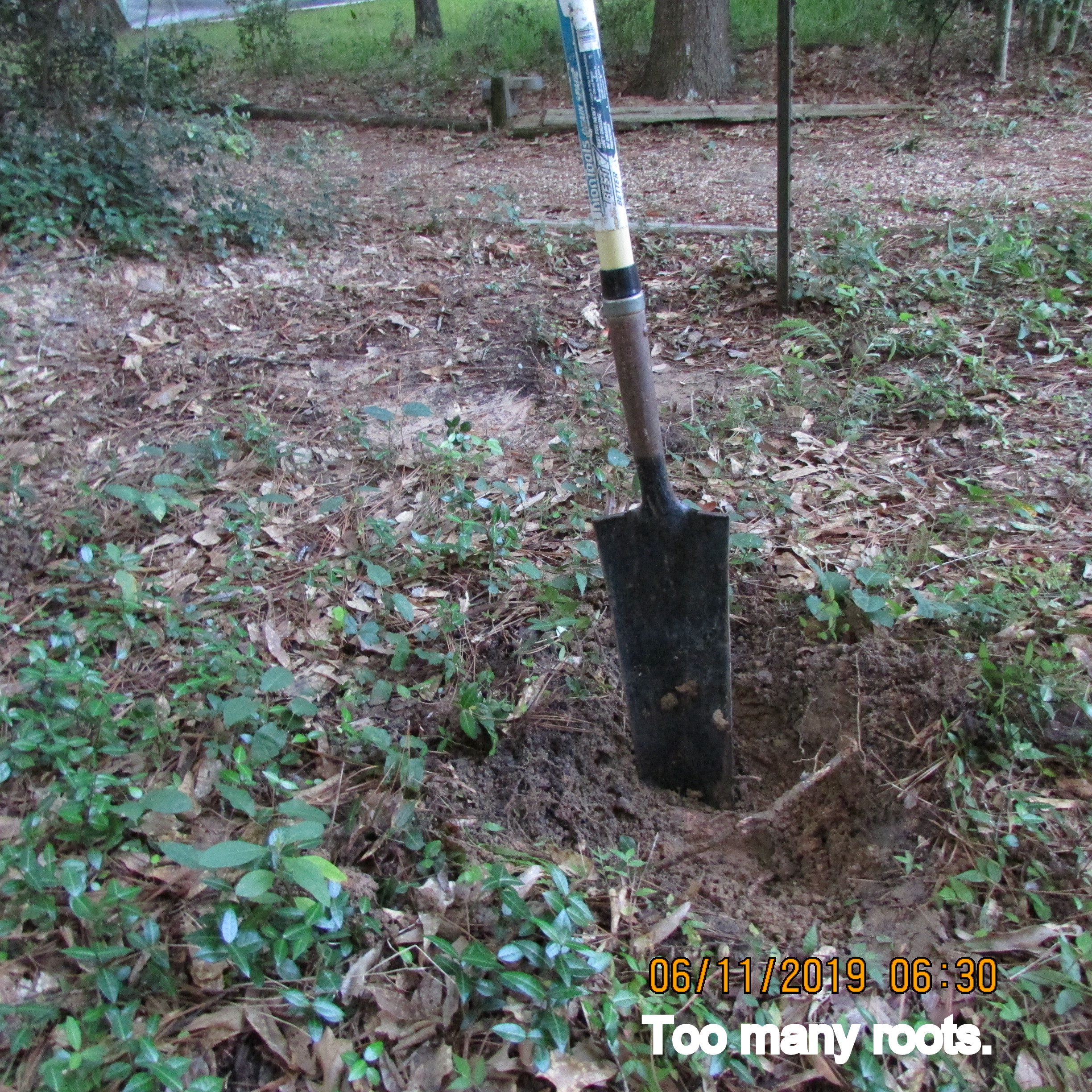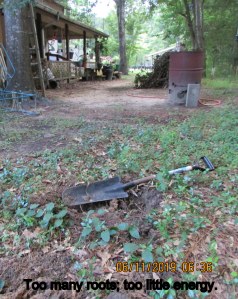 The mind is willing, the body is weak!! I was not able to get past the tree roots. The “spade” isn’t the tool for the project and a saber saw is needed to cut the roots. Defeated, I had to walk away. So I mopped up water in the laundry room and turned my back on the digging project.
