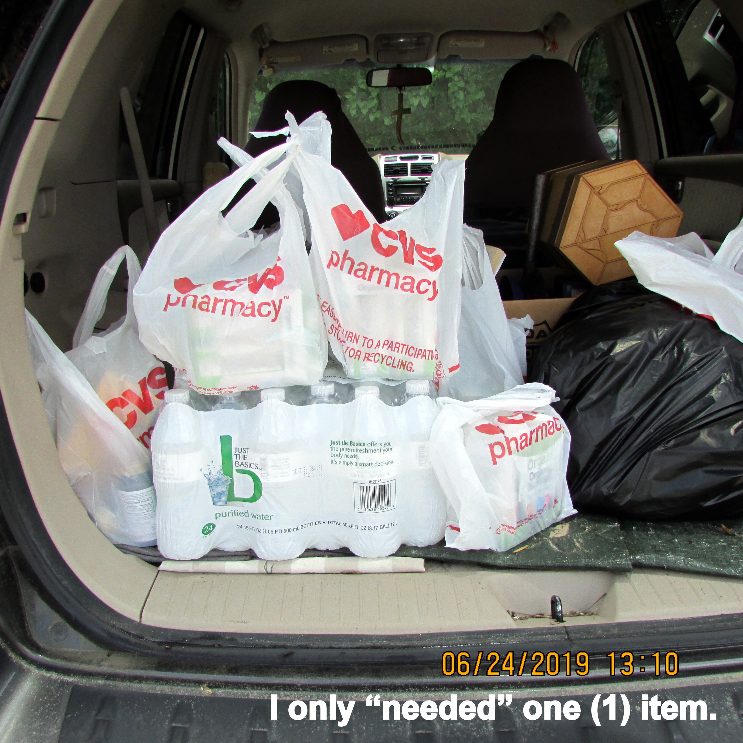 The weather was delightfully pleasant. I didn’t need the sweater. Today, a lot of “impulse” buying. I don’t “need” three more vases… but they will look nice on a “bottle tree.” I don’t “need” some of the items from CVS but they were “on sale.” I don’t “need” Gaterade (from the market) but it was in the “markdowns” (deeply discounted). I rushed home to put perishables into the refrigerator and freezer.