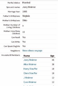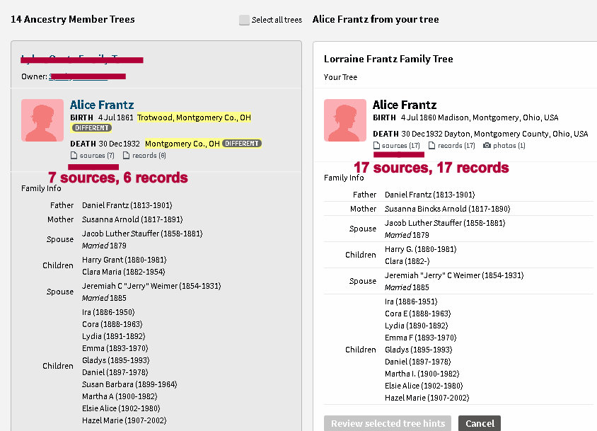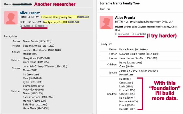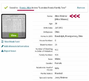 Believe it or not, it is relaxing to shift from Ancestry to the preparation of a blog message. Every day I say I’m not going to spend time “climbing the family tree” but it draws me like a magnet!! I’ve been documenting individuals listed in obituaries (forwarded from a cousin), One surname leads to another, and another (infinitum). Whenever possible, I attach a web link to the family history I published in 1996. Alice Frantz (image on the top right) “popped up” today so I’m in the process of building her branch of the tree. (Those “Frantz” women show up in the most unexpected places.) I say “brightened my day” because I was skeptical of some information. Finding information in the 1900 Federal Census was a goldmine: All her children from two marriages (image number four). I have five more sources than “top of the list other guy” (image number five) and I haven’t even begun to research and document her children.