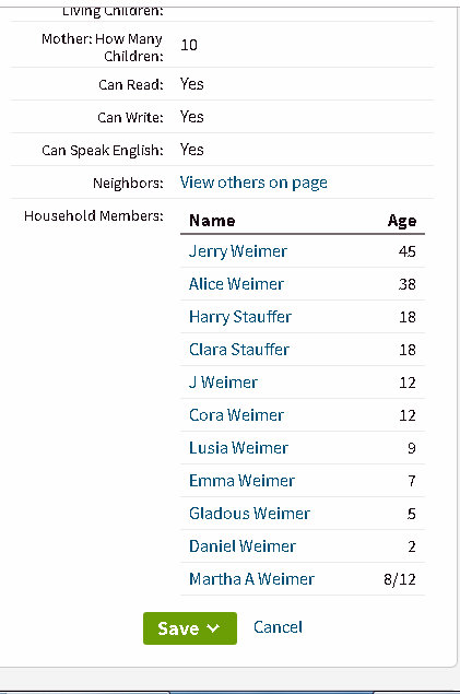 I suspected her name was misspelled. Years ago, one of my genealogy instructors (George Schweitzer) told of standing in another room and shouting a name to his wife. “What did you hear?” What the census taker heard is often the way the name was spelled (“France” for Frantz, “Near” for Neher). It is my belief some Census takers simply could not spell “Jeremiah” or “Lydia.” I’m using lessons from thirty years ago as I enjoy “armchair research.”