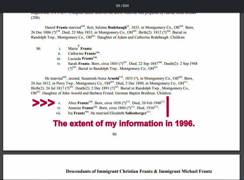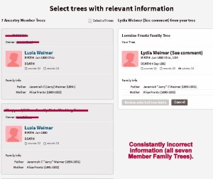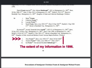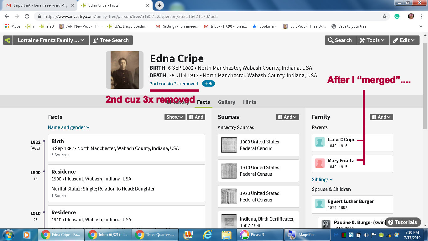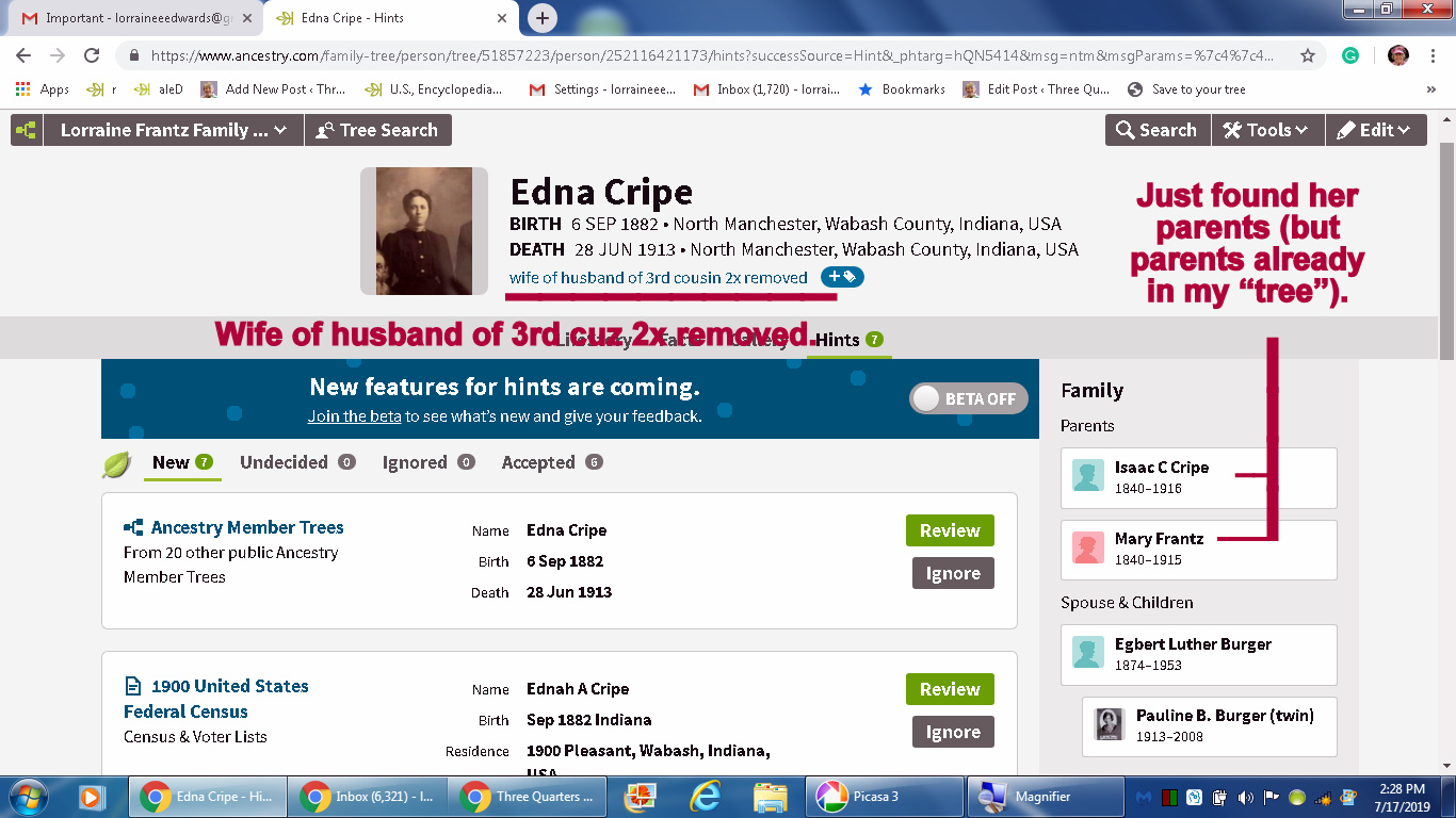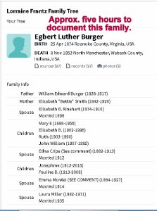 Today’s topic is “tree talk.” Many hours spent documenting this man’s family (above). That’s the finished display in Ancestry. “The other guys” (a bunch of nuts) had an illogical combination of information. I “hung in there” (on that branch of the tree) until details were accurate. Below see one of his four marriages. I find a surprise around every corner!! Her mother was a “Frantz.” Note how our relationship changed after I merged her parents into my database. No picture but the fourth wife (Laura Miller) is my third-cousin two-times-removed. (Click the images to enlarge for better viewing.)