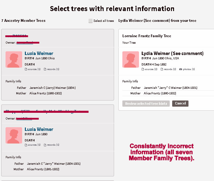 Yours truly is lethargic from extreme heat (weather). Are fellow Ancestry researchers too lethargic to search for sources? I’m not bragging (about my sources); I’m declaring the fact! First image (below) shows my data yesterday. Second image is my data, today at 3:00 PM. *EUREKA?* They don’t want to spend hours collecting data? Find another gripe further down in this message.
