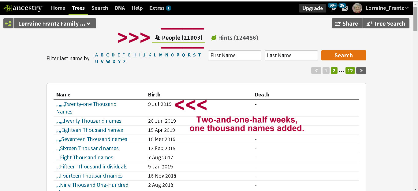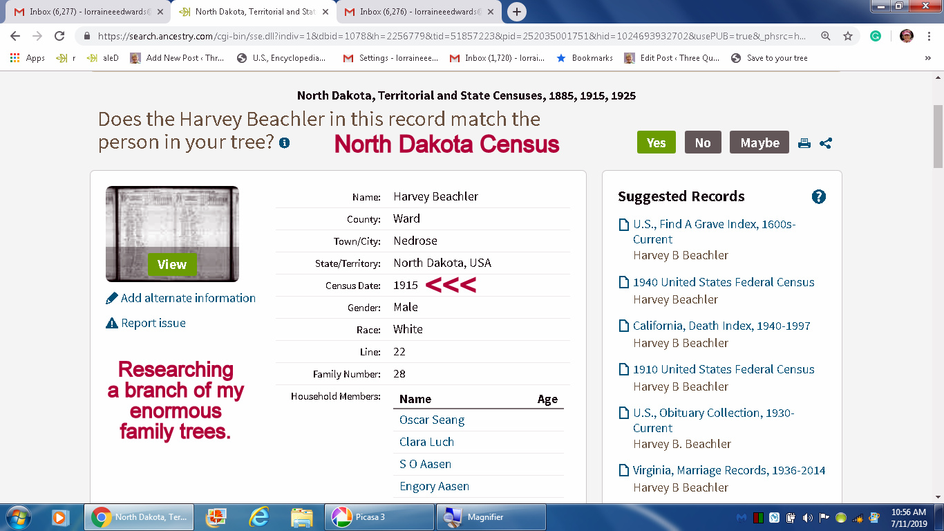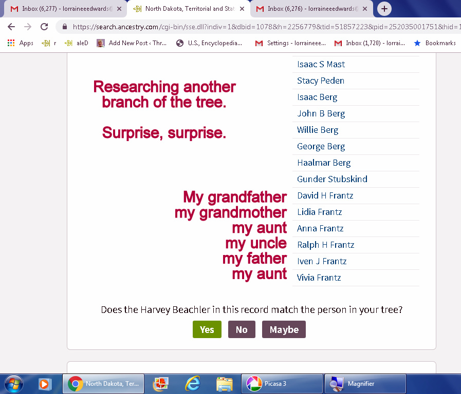 On Ancestry, a green leaf represents a “hint.” Lately, I have so many hints I can’t walk away from the computers. The “hints” are just begging me to attach them to my tree!! Same old story: No stopping point.