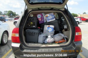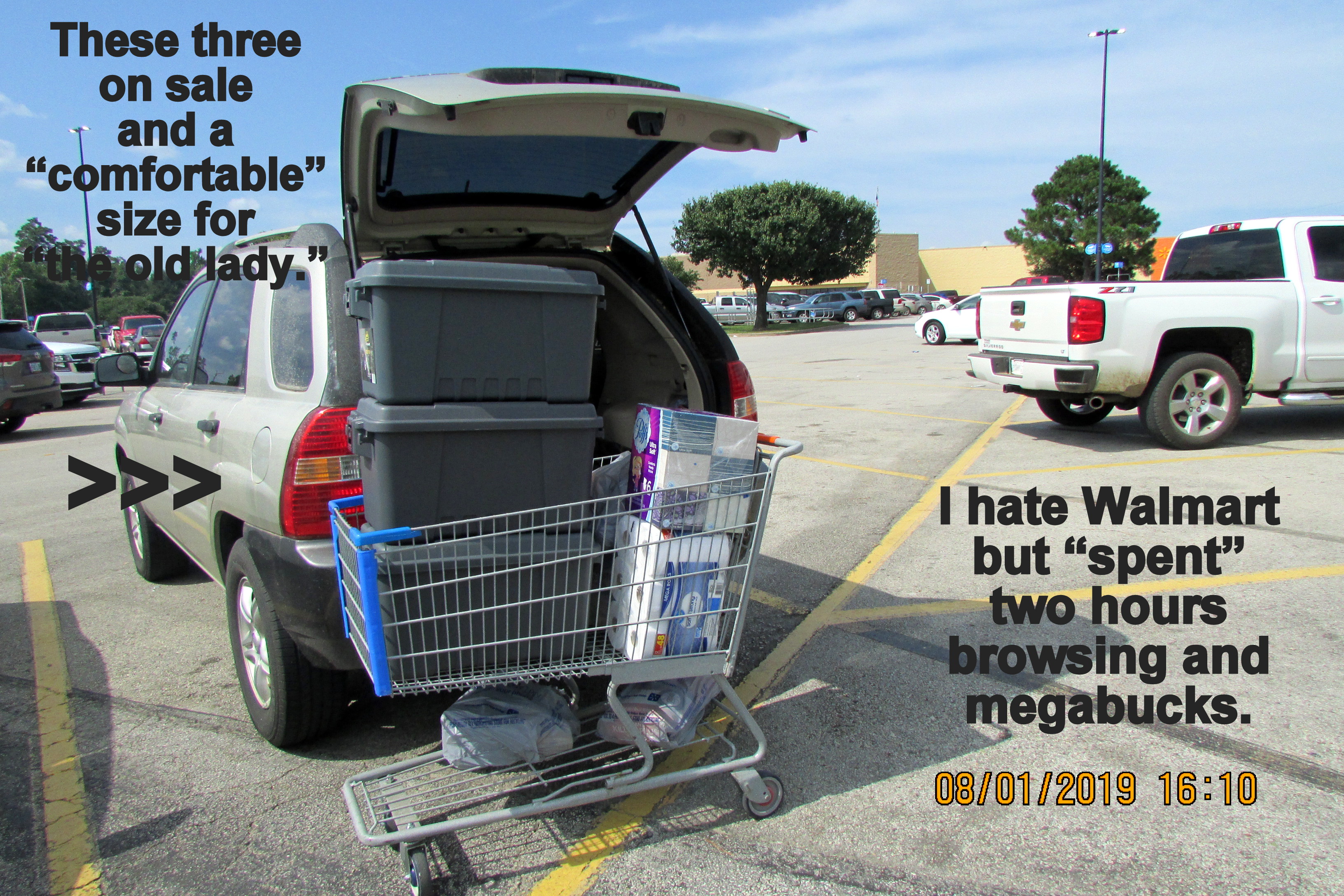 • Jimmie, I purchased food, and a charger for my “dumb phone” (because mine broke just before we were talking on the phone). The “totes with lids” will help me organize stuff I’m saving. I’m sorting… and lots going into the fire barrel or burn pile. Also bought toilet tissue, paper towels, and Kleenex so most of purchases will eventually be used. I’m not adding stuff!! I walked through the garden department and saw things I’d like but did not purchase. However, out of necessity, I bought a bag of Fire Ant killer.