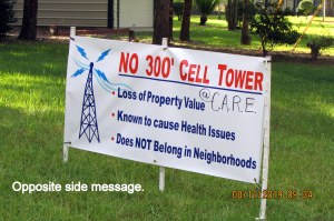 One of the concerns expressed by the negative signs, is that it will diminish property values. There is no apparent reason for this claim, except conjecture. In fact, negative signs posted throughout the community will probably do more to diminish property values than a cell tower would.