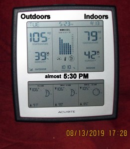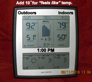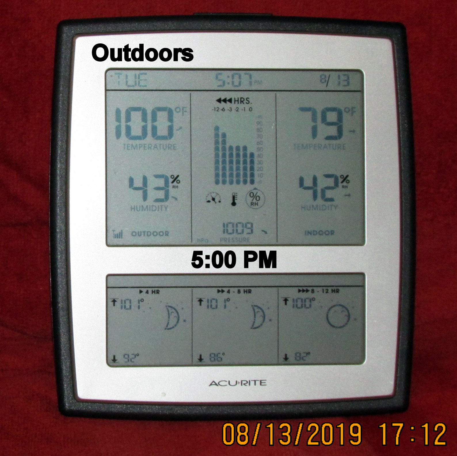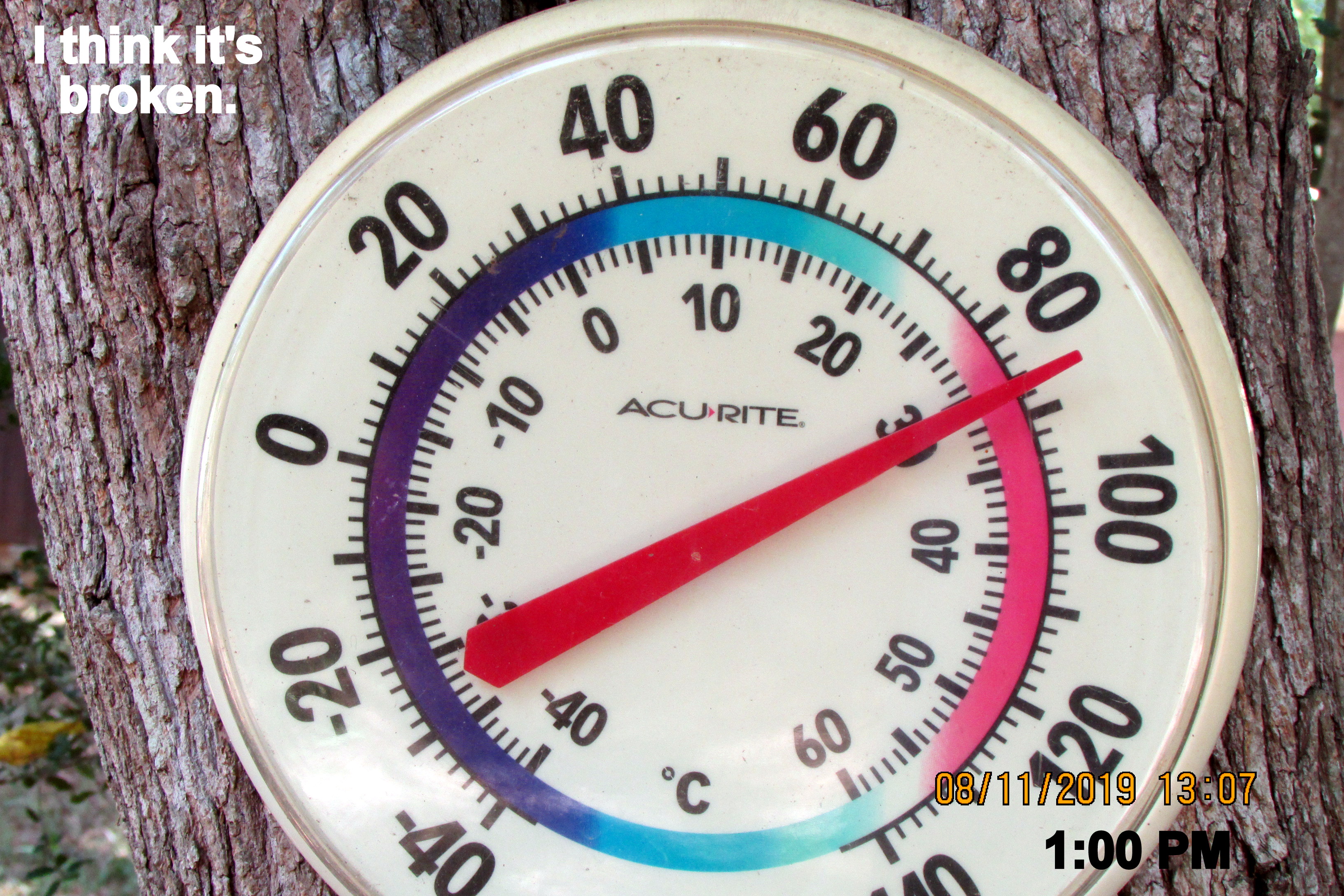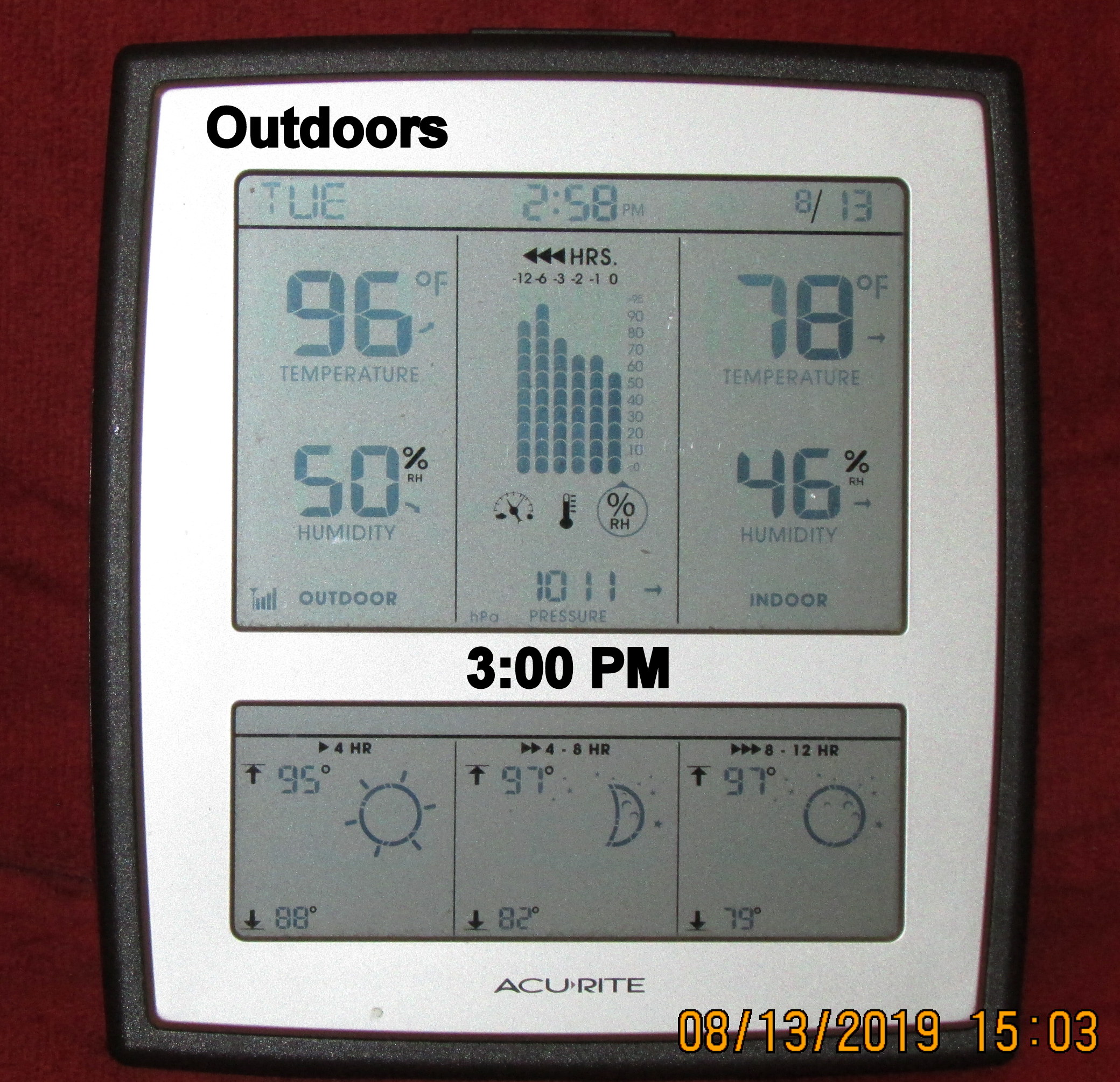 Gratefully, quick response to our signs. It is so good to have another individual who knows the dangers of cell tower radiation, and the detriment to our health. Several of us were in deep discussions, in extreme heat. Finally, “old lady” said she had to get out of the sun. Here are pictures of thermometers as soon as I got home. Outdoor thermometer must be broken?