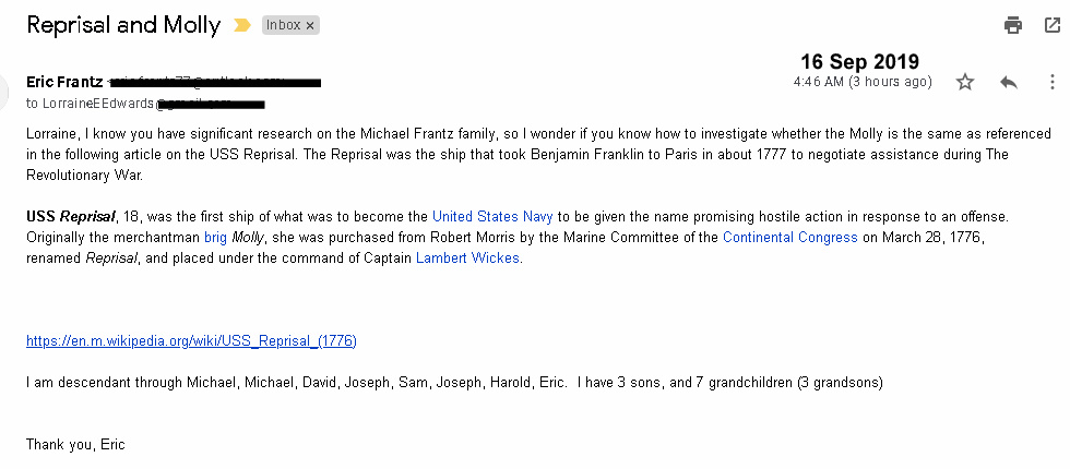 This email message greeted me early yesterday morning. (Click to enlarge for better viewing.) Naturally (before my first sip of coffee), I went to my Ancestry database to identify this “cousin.” OMG, I don’t have the father, grandfather, and great-grandfather in my “tree.” One-thousand-seven-hundred-fifty-eight (1,758) individuals with the surname “Frantz” and this branch of the tree is missing!! Obviously, I had to remedy that error. I see this as a several days project because numerous descendants of Samuel. ~~ I’m abundantly blessed because I have a “forest” of families and “cousins” visit me (via email) and shower me with additional family information.