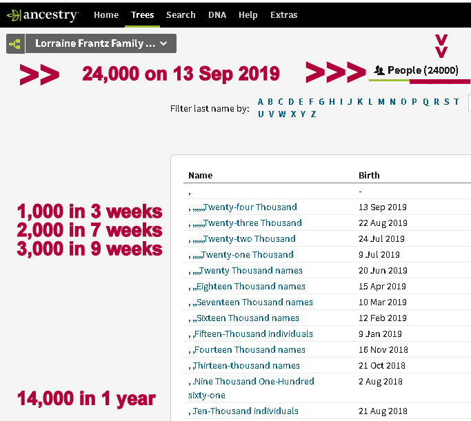 Escalating numbers ?! Sep14 by Lorraine Frantz Edwards Honestly, I can’t believe I’ve added so many individuals to my Ancestry database. “Time flies when we’re having fun.” I’m blessed with a forest of family and I’m eager to document them before my clock stops ticking. Share this: Click to share on X (Opens in new window) X Click to share on Facebook (Opens in new window) Facebook Like Loading...