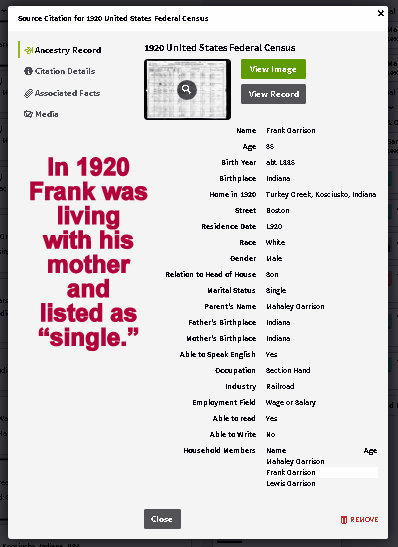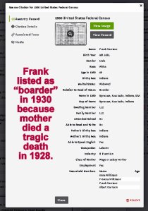 Where was the father? In the 1920 Federal Census, Frank was living at home with his mother–and listed as “single.”