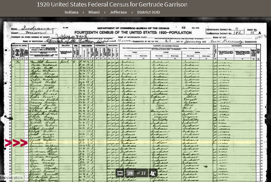 Gertrude Janet Garrison had four living brothers who experienced the broken home after the death of their mother in 1918. In the 1920 Federal Census, Gertrude (age nine), and William (age five), in the Orphan’s Home.