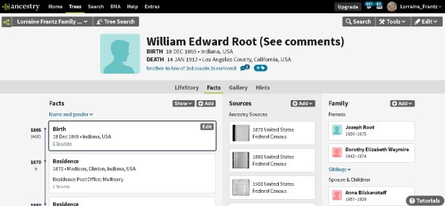 “It’s a small world after all” is a tune we hum after a visit to a ride at Disneyland in Anaheim, California. My “small world” experience is the fact that I documented (and published) LaVerne Evergreen Cemetery Tombstone Inscriptions (1989) and I read the tombstones for William E. & Anna Blickenstaff Root. Very likely my grandparents (David & Lydia Frantz) were friends with William & Anna.