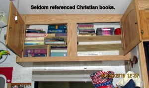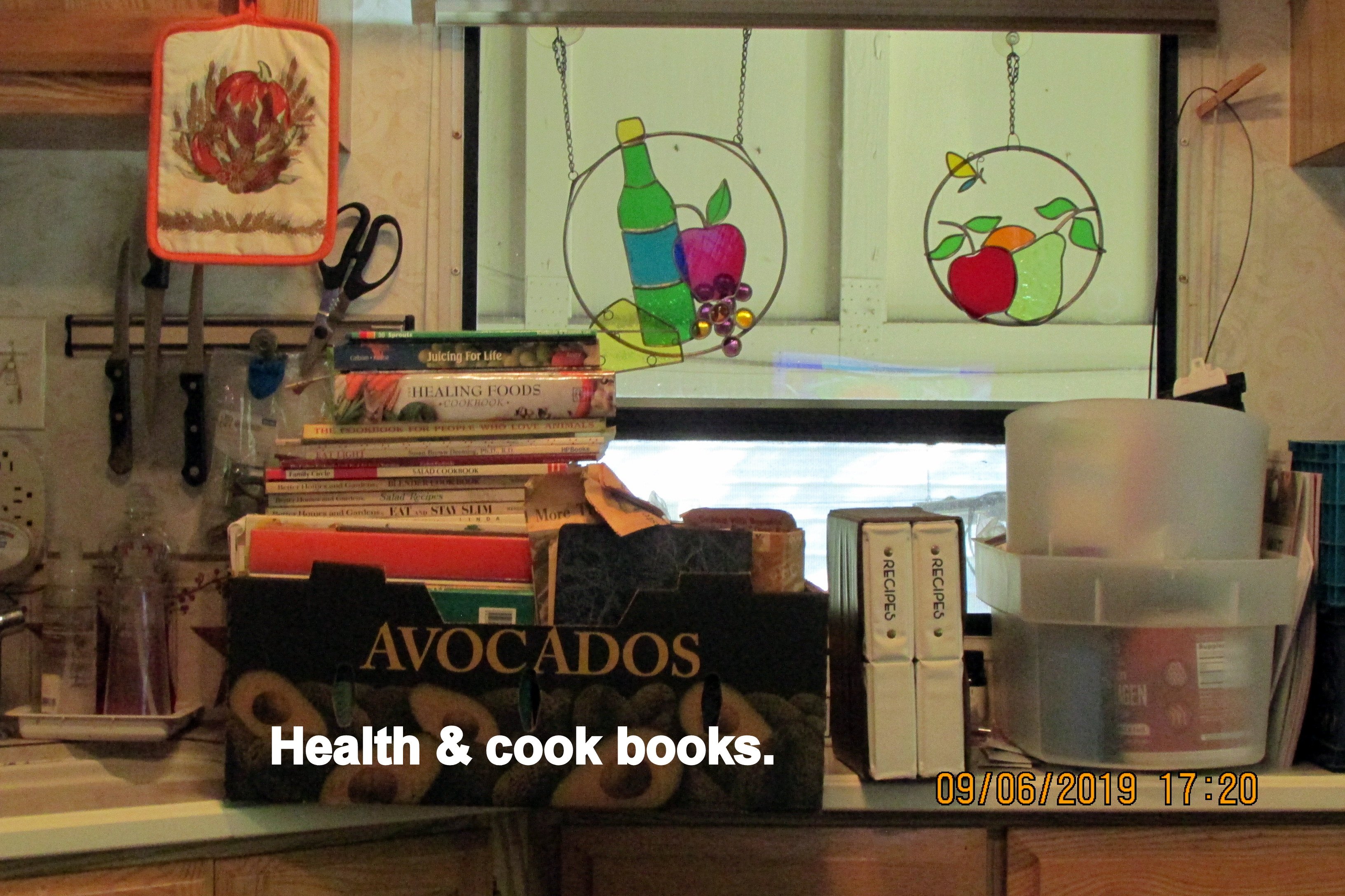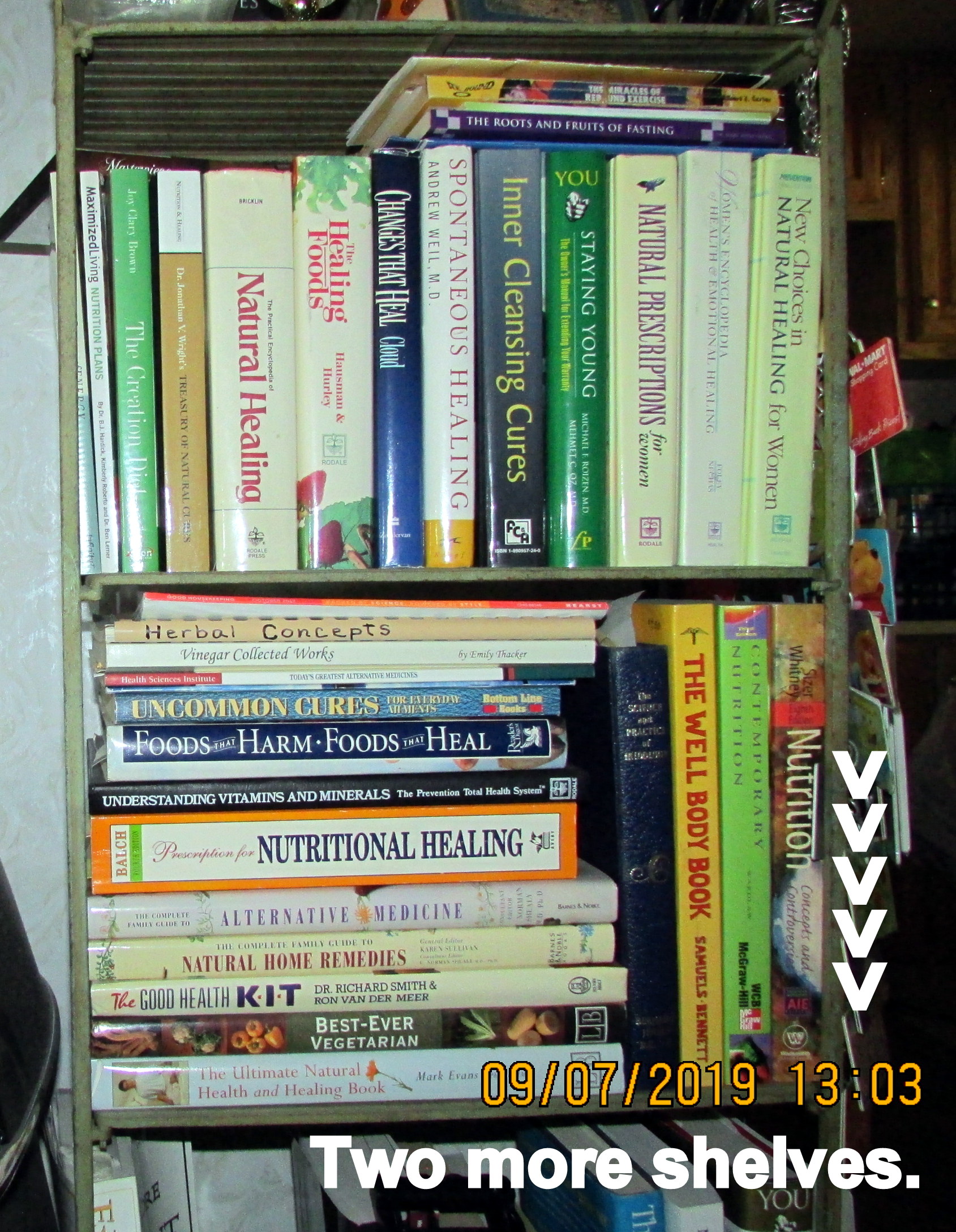 Typed words, decades ago, these two rhymes are in the front of a loose-leaf notebook full of recipes I saved through the years. I’m “too sentimental” to discard the notebook; I’m “saving” it and a few other cookbooks. Most of my “health” books library–and “health” cookbooks–will go to a young woman preparing to be a naturopathic nutritionist. (Picture on the right is my current library of health books.) ~~ Before I left North Carolina, in 2013, I donated seventeen boxes of health books to my chiropractor (for his office). I’ve practiced “health and nutrition” half my lifetime. (“Practiced” but not perfected, ha.)
