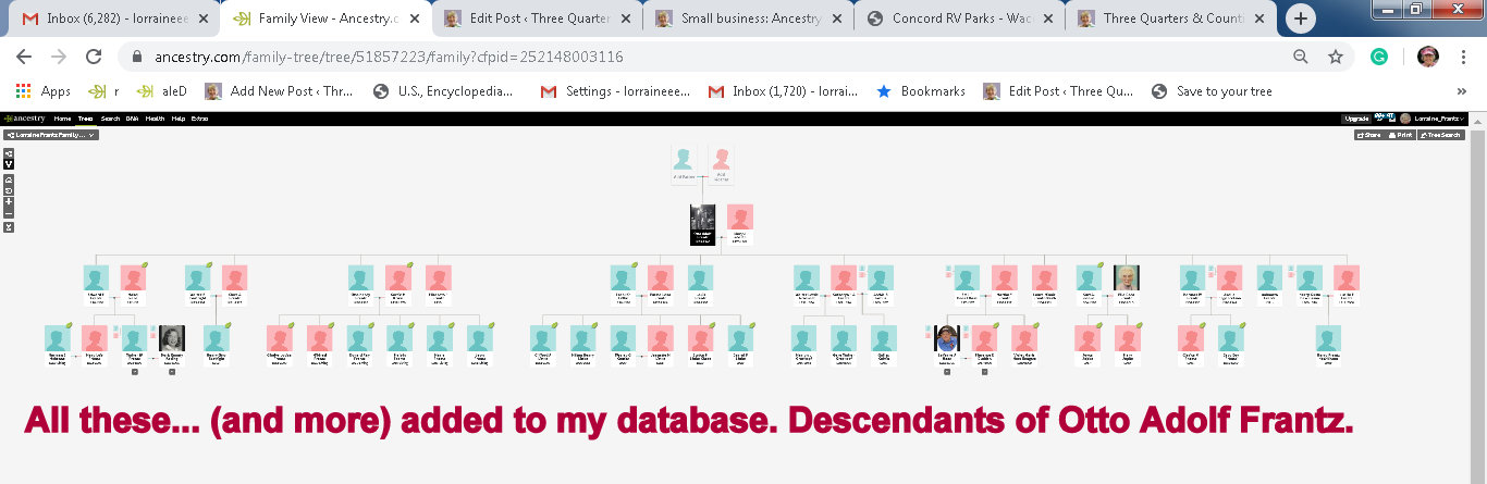 In my email messages this morning, an inquiry about possible family relationship. So I searched my Ancestry datbase and I didn’t have her relative. Almost two-thousand individuals with the Frantz surname (in my database) but I didn’t have Otto Adolf Frantz (1859-1945). So I started searching for his family and here I am seven hours later still in my pajamas (and no breakfast or lunch). It is a pleasant eighty degrees outdoors and indoors. I should be outdoors tackling projects!!