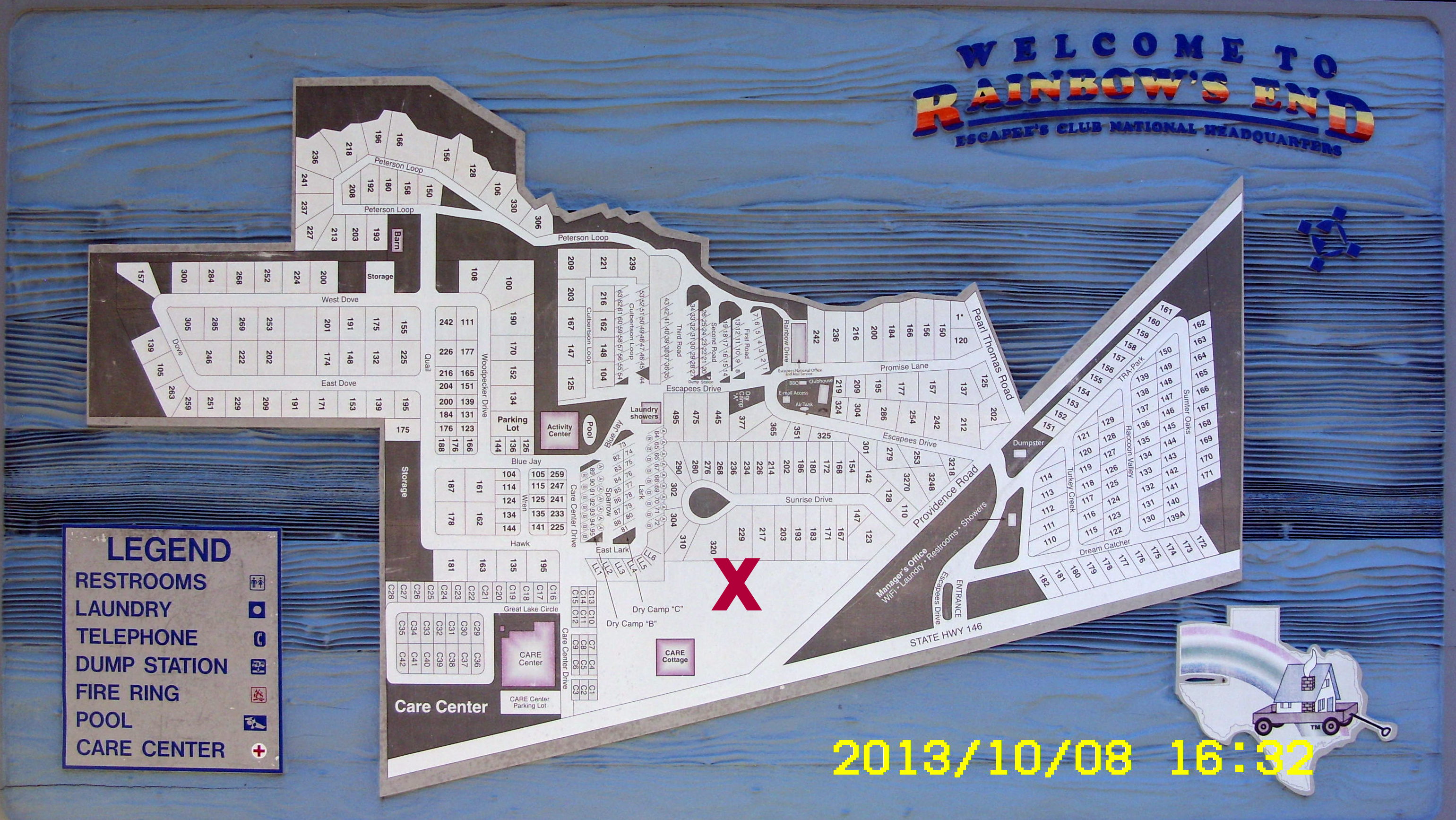 Several friends were in contact with AT&T and FCC regarding the placement of a cell phone tower in their backyard. Their valiant fight to stop the tower was obviously respected by “big business.” Although their names are not listed here, I feel compelled to “give thanks” to individuals who fought for the health of several hundred folks living at Escapees Rainbow’s End RV Park, and Escapees CARE. “Yes,” several hundred people live at Rainbow’s End. See the map; “X” marks the spot where the tower would have been erected.