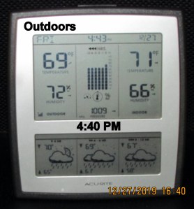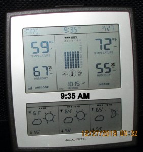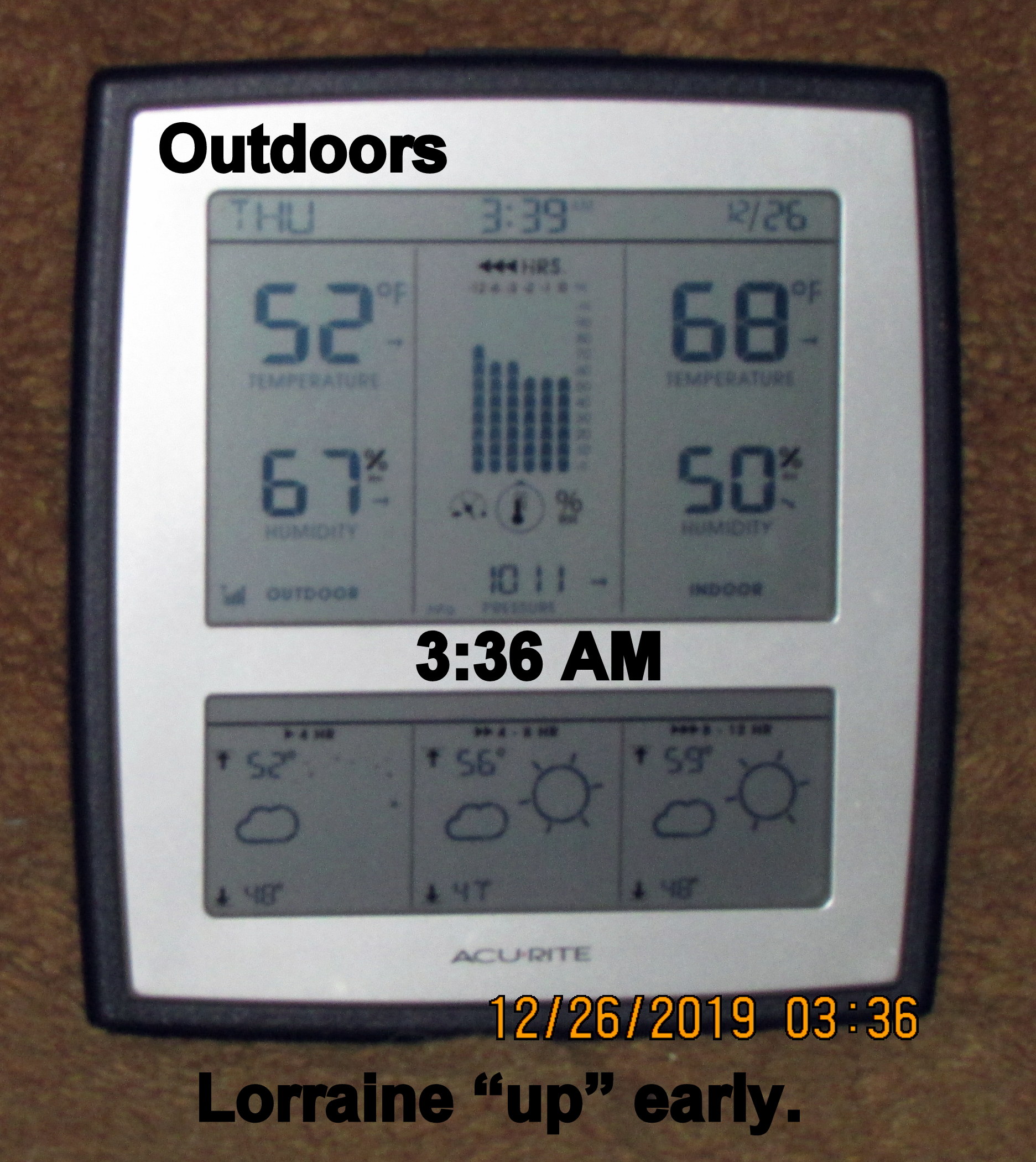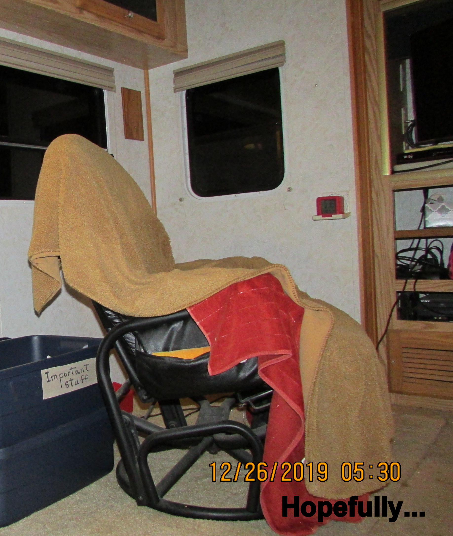 Two Aleve in the early afternoon. More crawling around (this morning) with spray can of rug shampoo and a scrub brush. OMG, the odor of rug shampoo is overwhelming!! I have the door and a window open for ventilation. A gloomy day but warm enough to have door and window open. ~~ Keep your fingers crossed for me or say a prayer because a man stopped to look at the 5th-wheel and appears very interested. I will be eternally grateful if I can sell the trailer before I drive back to Waco!! ~~ Where does the time go? I couldn’t believe it was “afternoon” when I sat down (to rest) and prepare this message.