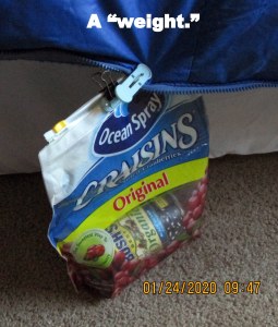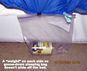 Somewhere in the storage building, I have blankets. When weather permits–and I have a hired helper–the storage building will be organized. Meanwhile, I’m grateful for the wonderful, extremely-warm goose-down sleeping bag. The fabric reminds me of silk or satin because it is so smooth. Hence, it easily slides off the bed. Therefore, “necessity is the mother of invention” so I created two weights. (FYI: An attractive RV sleeping bag remained in the 5th-wheel trailer because it “matched” the bedroom.)
