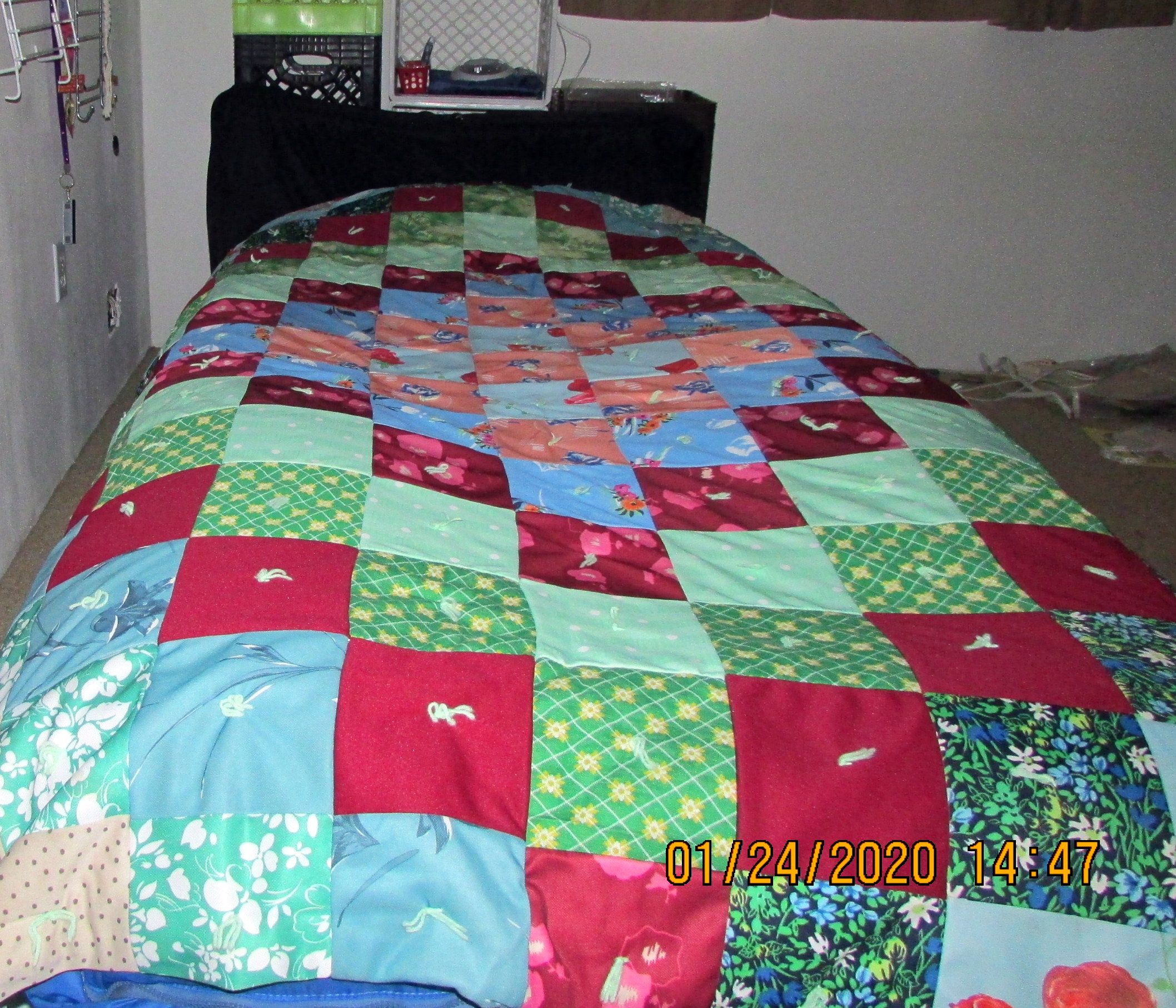 The location of surplus bedding is still a mystery. I found the quilt that has sentimental value. My mother had a closet full of polyester dresses!! After she went to our Heavenly Home, I took the dresses to my Old German Baptist Brethren “cousins” in Modesto, California. Dear, dear family members lovingly prepared this quilt. My mother went to be with Jesus on 29 Sep 1994. After all these years, I can still “see” my mother in various dresses.