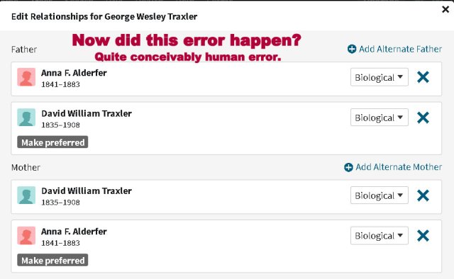 Today I recognize (among other things) I should be a ballet dancer. Why? Because I must always be “on my toes.” (lol) Yesterday I established a new “tree” on Ancestry.com. This morning, I was “dancing” between my two trees and found this strange error on my original tree. How did this happen? I am a fanatic about accuracy in my family tree. Last night, I was experiencing “pride” because I successfully accomplished the Herculean task of importing information from a “thumb drive.” Remember the quote “Pride goes before a fall.”