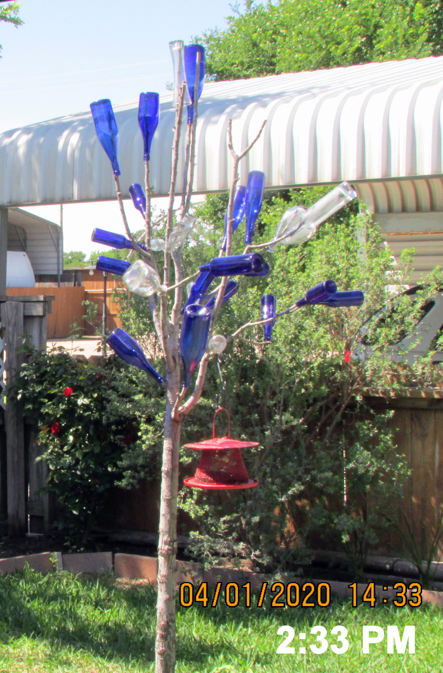 Many weeks ago, I asked the owner/manager if “bottle trees” were allowed in this RV Park. He said it is my yard and I can do anything I want. How refreshing!! For six years, I had restrictions on my gardening.